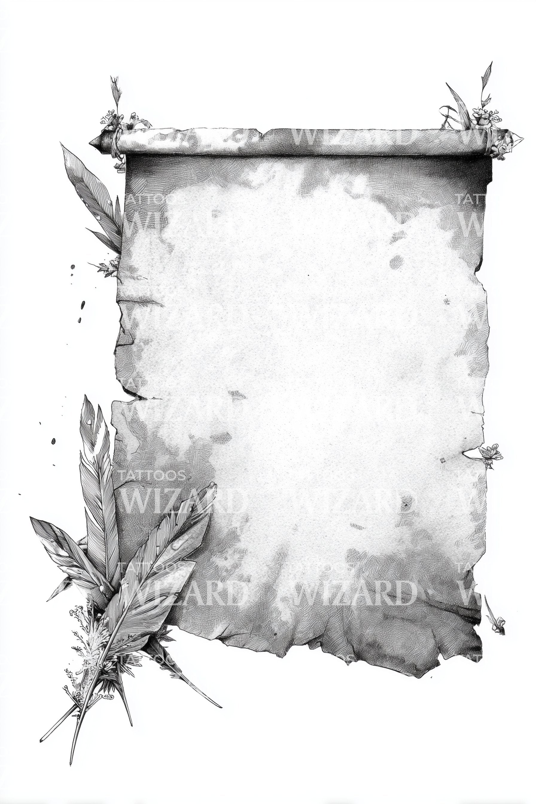 Weathered parchment unfurls in black and grey, rimmed with soft smoke and delicate ornamental sprigs. A cluster of quills anchors the frame, inviting vows and untold stories. Symbol of memory, freedom, and transformation, this design feels intimate, timeless, and weightless, carrying your unwritten chapter close through every day.