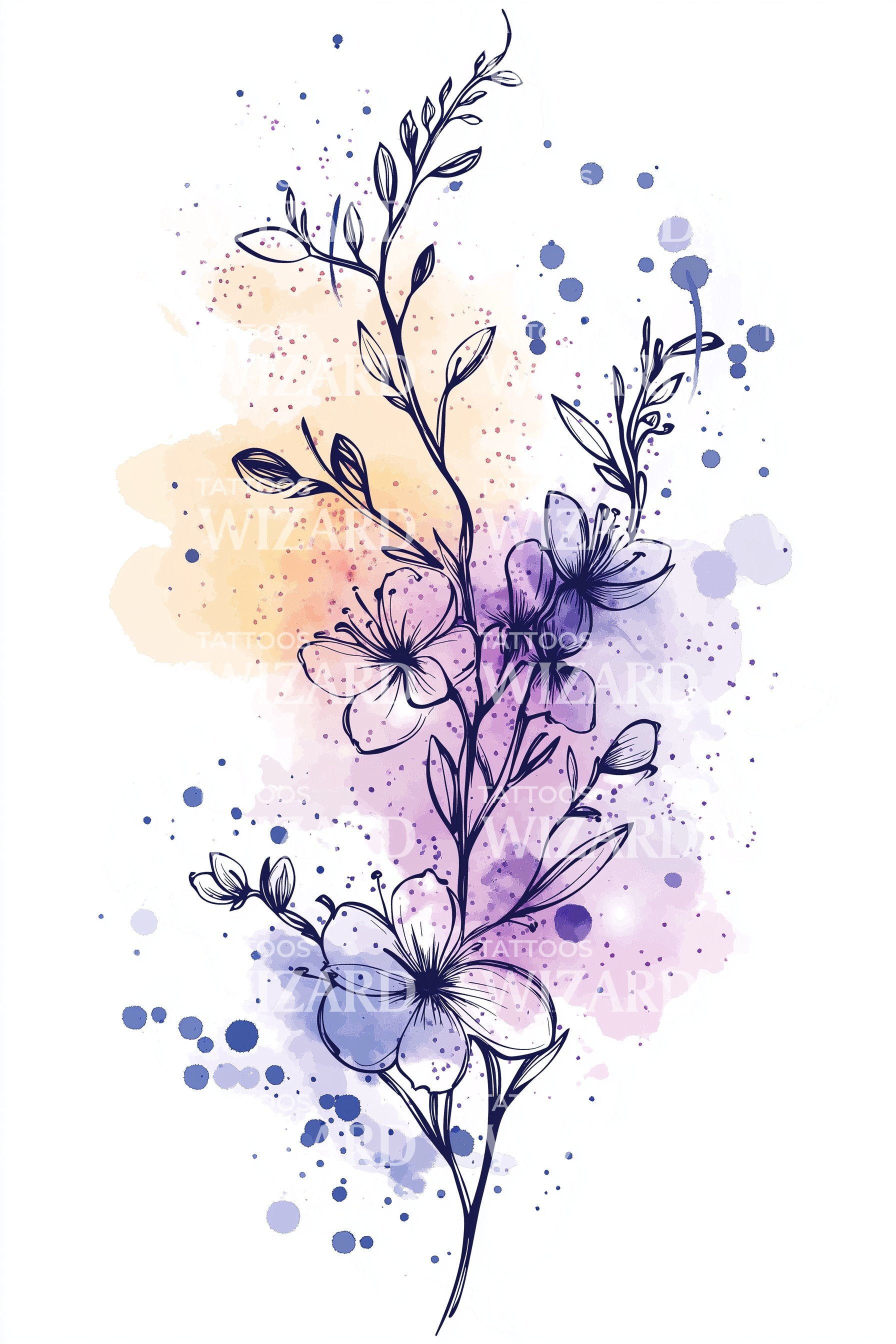 Immerse in natural beauty with this delicate wildflower tattoo design. Painted in attractive pastel hues, the spray of flora cascades down a branch, captured in ethereal watercolor strokes. This tattoo design is a perfect choice for lovers of subtle, graceful art and the gentle charm of wildflowers.
