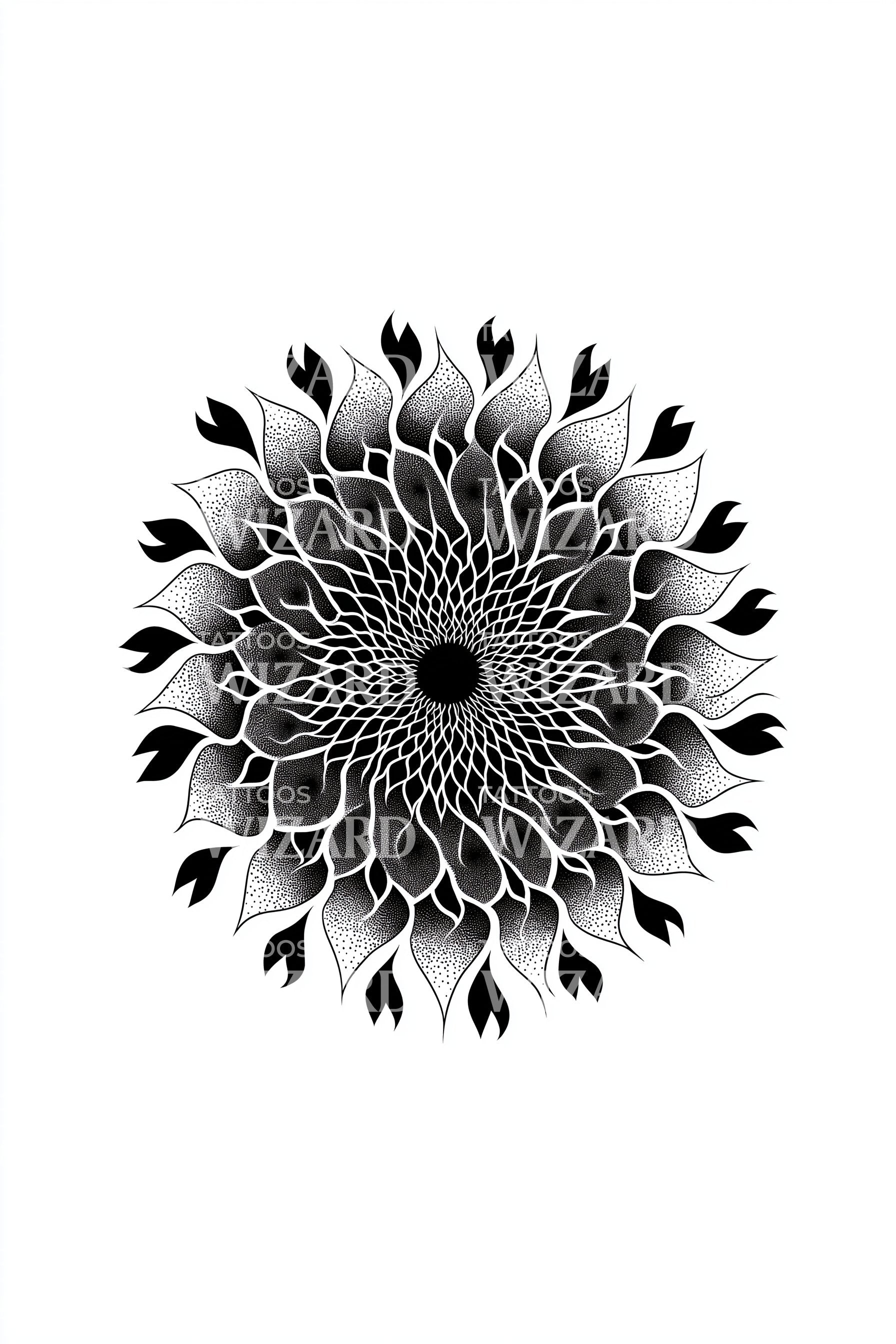 Immerse in the beauty of dusk with this stunning mandala tattoo design. Featuring a delicately crafted pattern of petals and leaves, each element gradually shifts from one shade to another, reflecting the mesmerizing gradient of a twilight sky. Exceptionally ornate, this flower mandala encapsulates serenity.