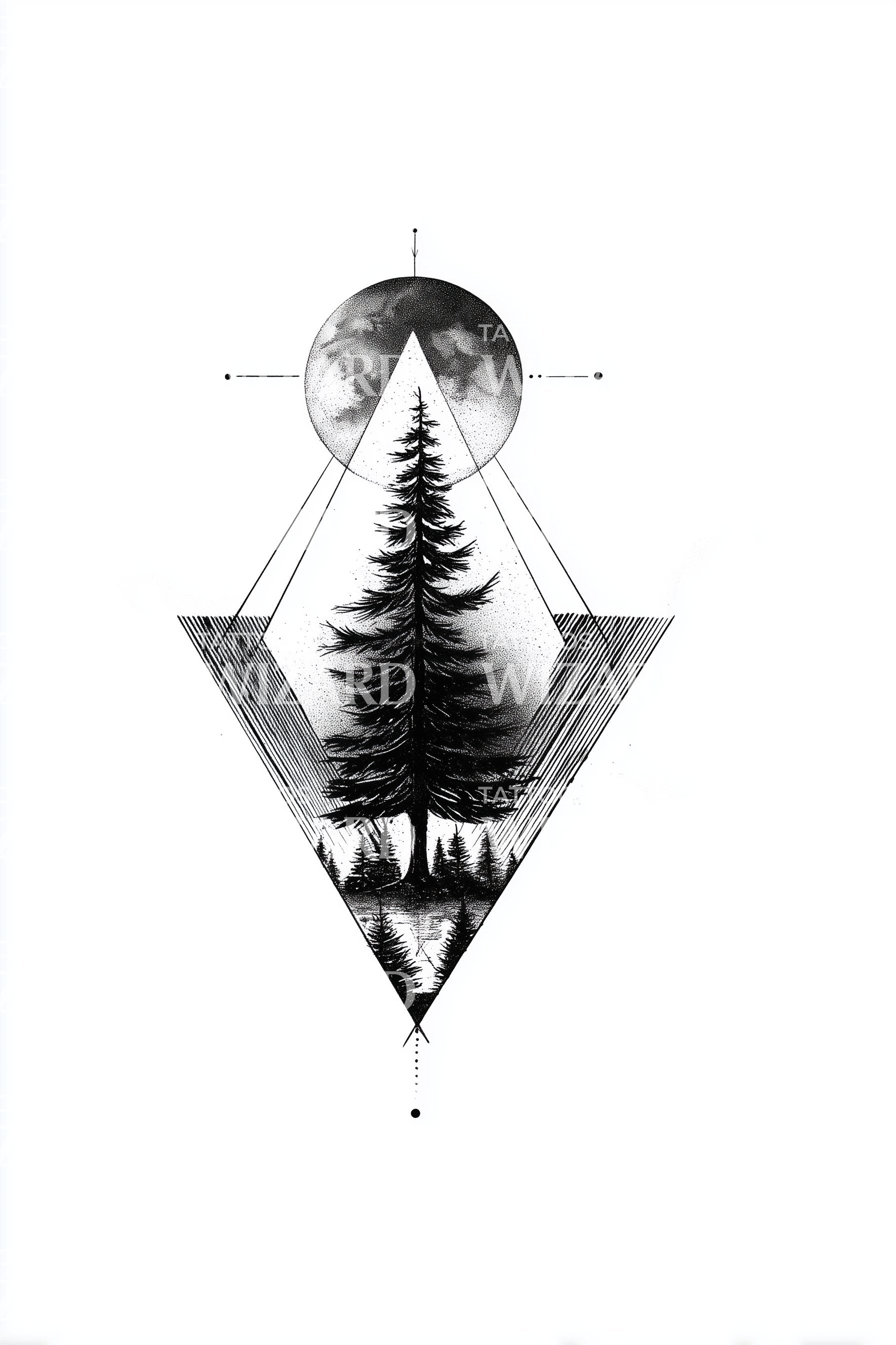 Geometric pine tree rises within a mirrored triangle, crowned by a softly shaded moon and precise dotted lines. The sacred alignment speaks of balance, roots and ascent, night and guidance. Minimal yet deep, this design feels grounding and luminous, a quiet compass for wanderers who honor stillness and wonder.