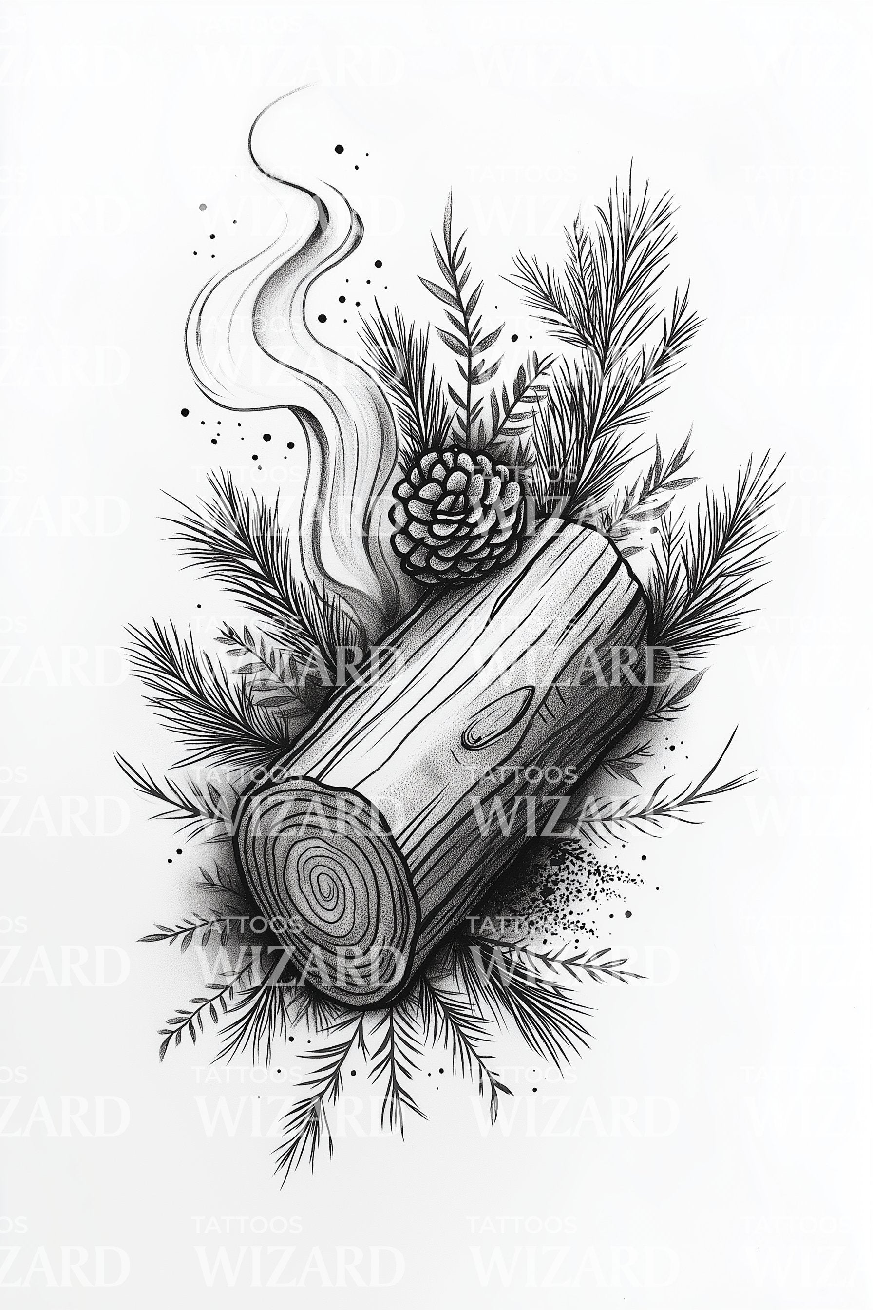 Illustrative blackwork captures a cut log nestled in fir needles, a pinecone crowned by drifting smoke. Rings and stipple shading echo time and endurance. Forest breath, winter hush, hearth-warmth. Worn on skin, this talisman whispers of homecoming, resilience, and the ember glow that guides wanderers through snowbound nights.