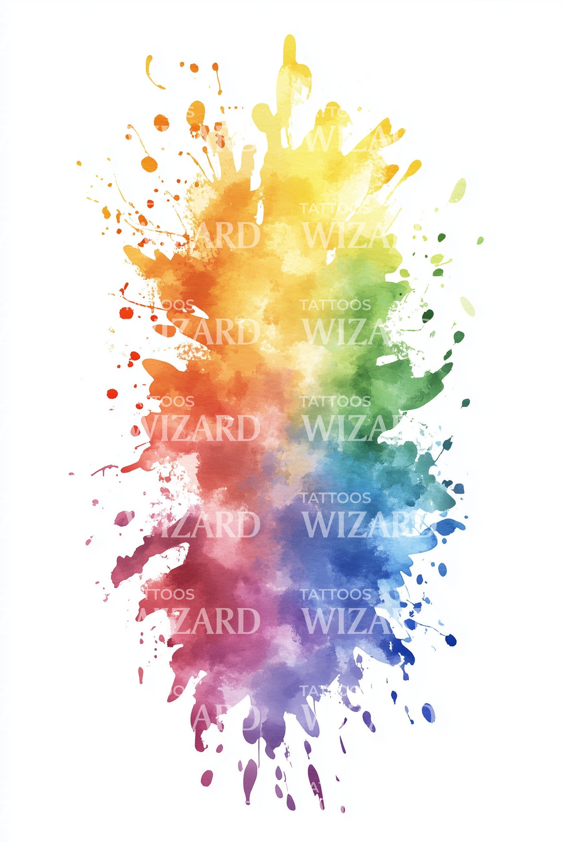 Immerse in the vibrant hues of this abstract watercolor tattoo design. Bold splashes of rainbow colors evoke a sense of creativity and freedom. This unique piece brightens any skin tone, making it stand out with its paint-inspired style. Perfect for those who love color and unconventional designs.
