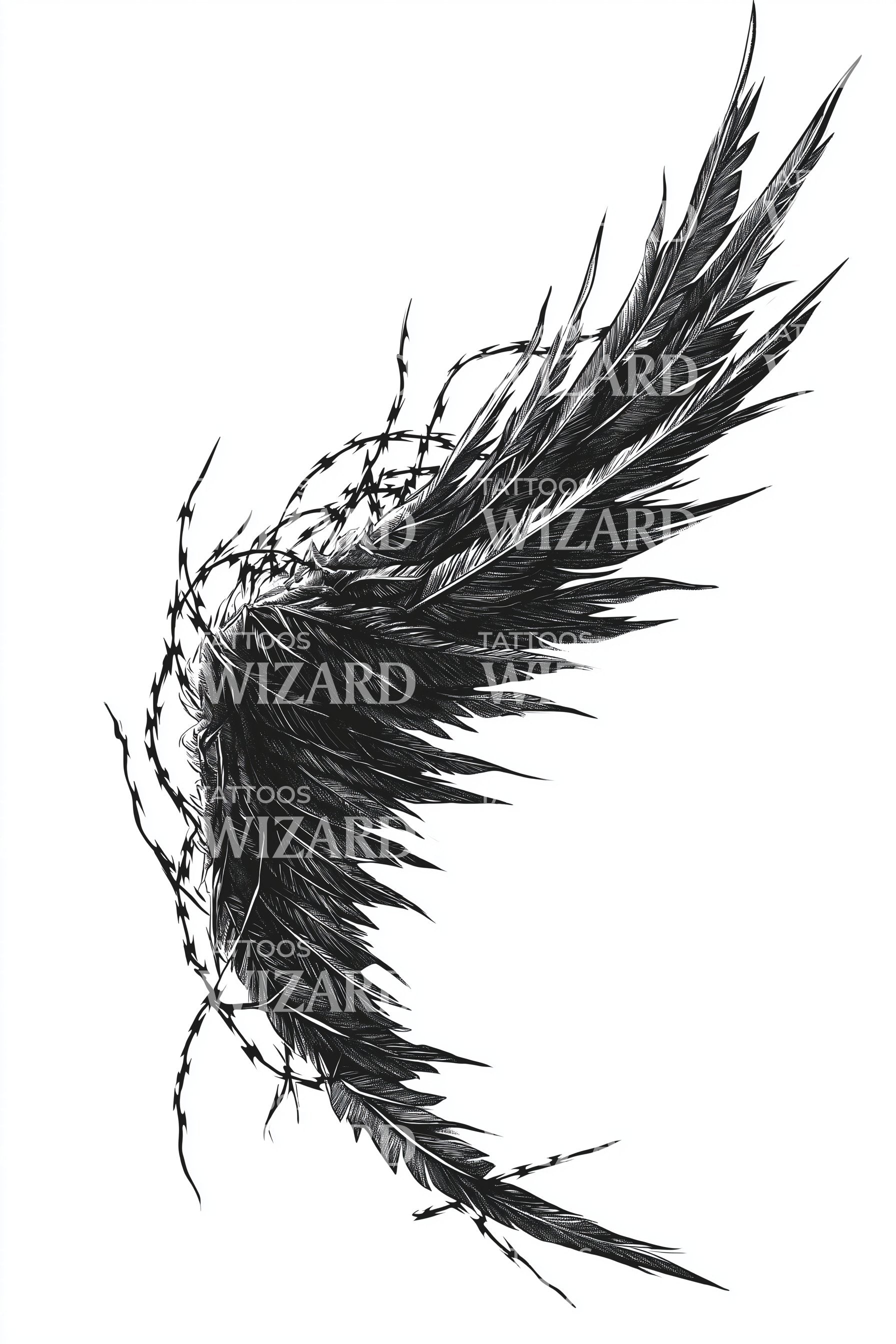 Black&grey raven wing unfurls in serrated feathers, edged with shadow, entwined by thorned coils. Symbol of endurance and untamed flight, it honors survival through the dark, forging grace from grit. Worn, it feels fierce yet protective, a quiet storm on skin, summoning resolve, clarity, and forward motion.