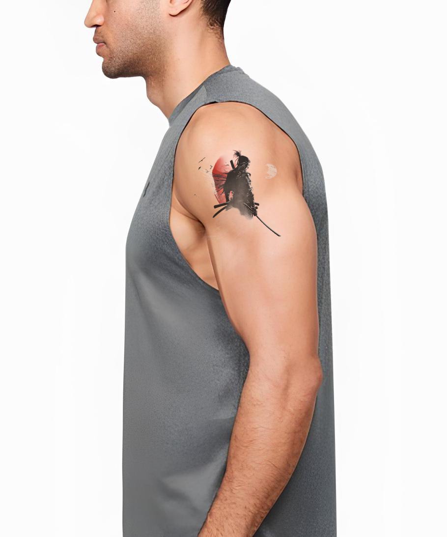 Immerse yourself in the fearless spirit of a Japanese samurai with this tattoo design. Boldly featuring a warrior clutching a sabre against a striking red sun backdrop, this design embodies power and resilience. Traditional yet stylish, it's sure to catch the eye of true Japanese arts admirers.