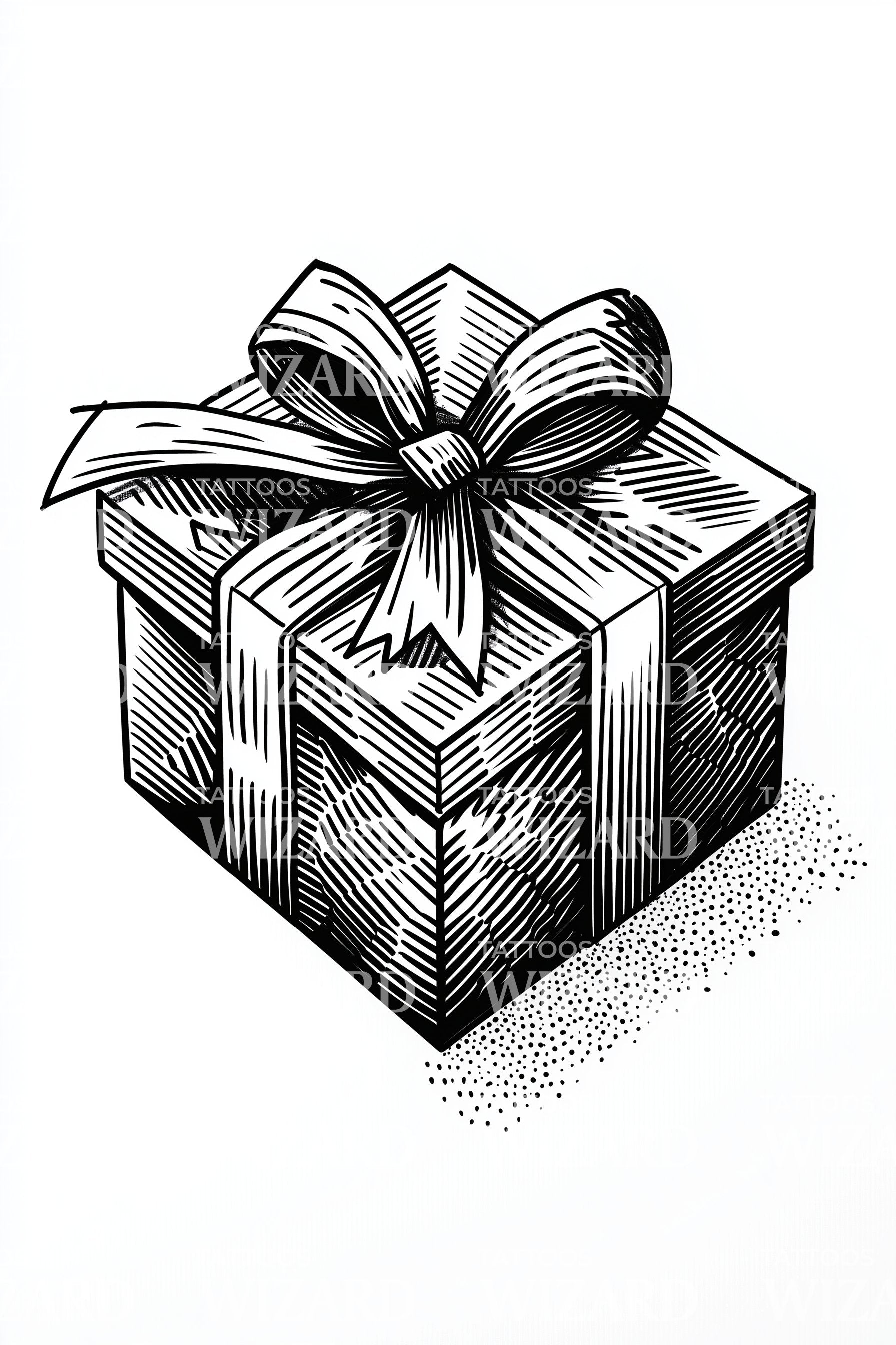Gift-wrapped wonder rendered in crisp dotwork and textured lines, a square box crowned with a flowing ribbon and a soft halo of stippled shadow. Symbol of presence in the present, it honors surprise, generosity, and holiday magic. Worn daily, it feels like anticipation, gratitude, and quiet joy.