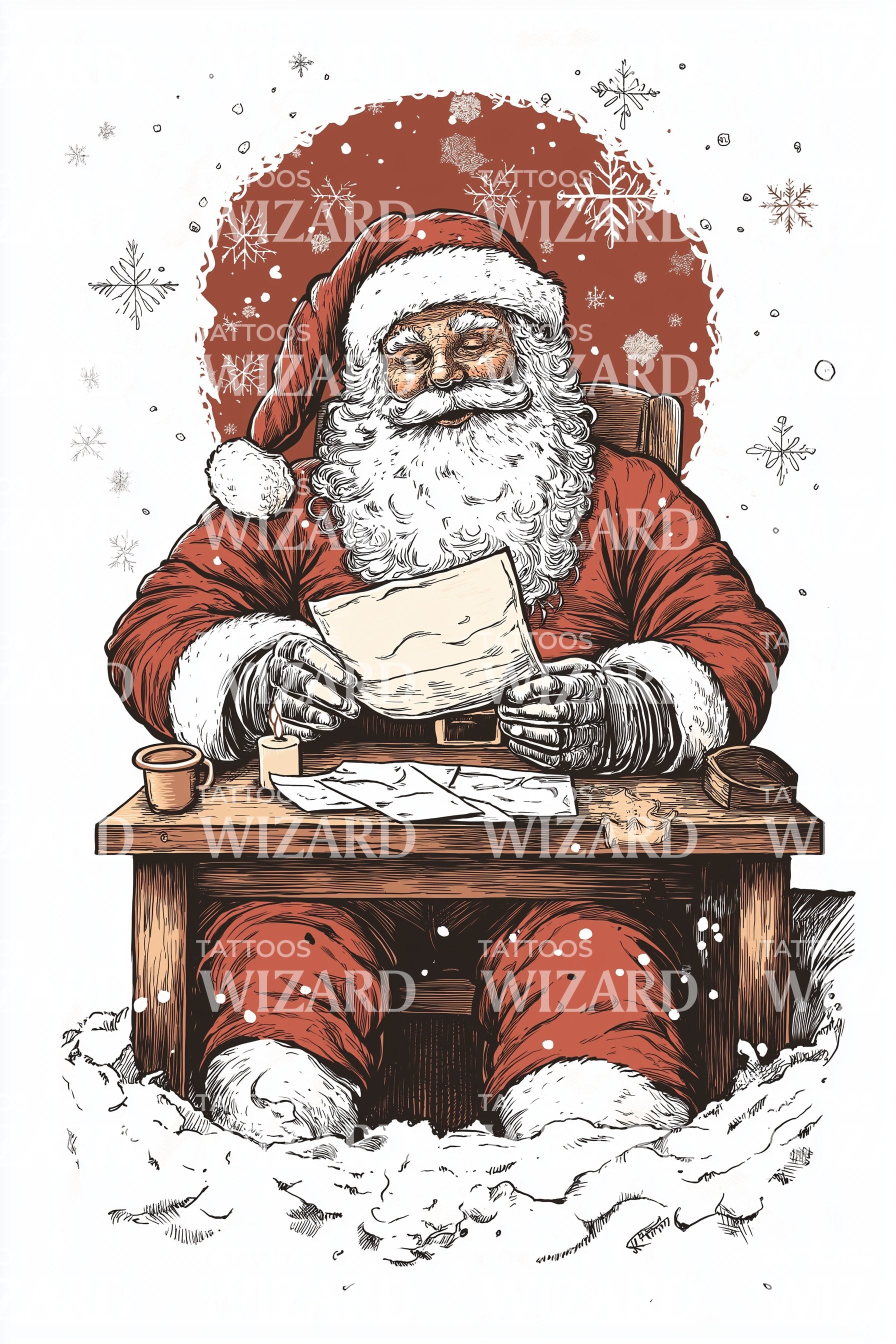 Vintage illustrative linework frames Santa at a rustic table, mitts cradling a letter amid snowflakes and a warm red halo. Each envelope symbolizes wishes heard, kindness counted, and joy shared at Christmas. Wearing this piece feels like keeping a hearth-lit promise of hope, generosity, and childlike wonder.
