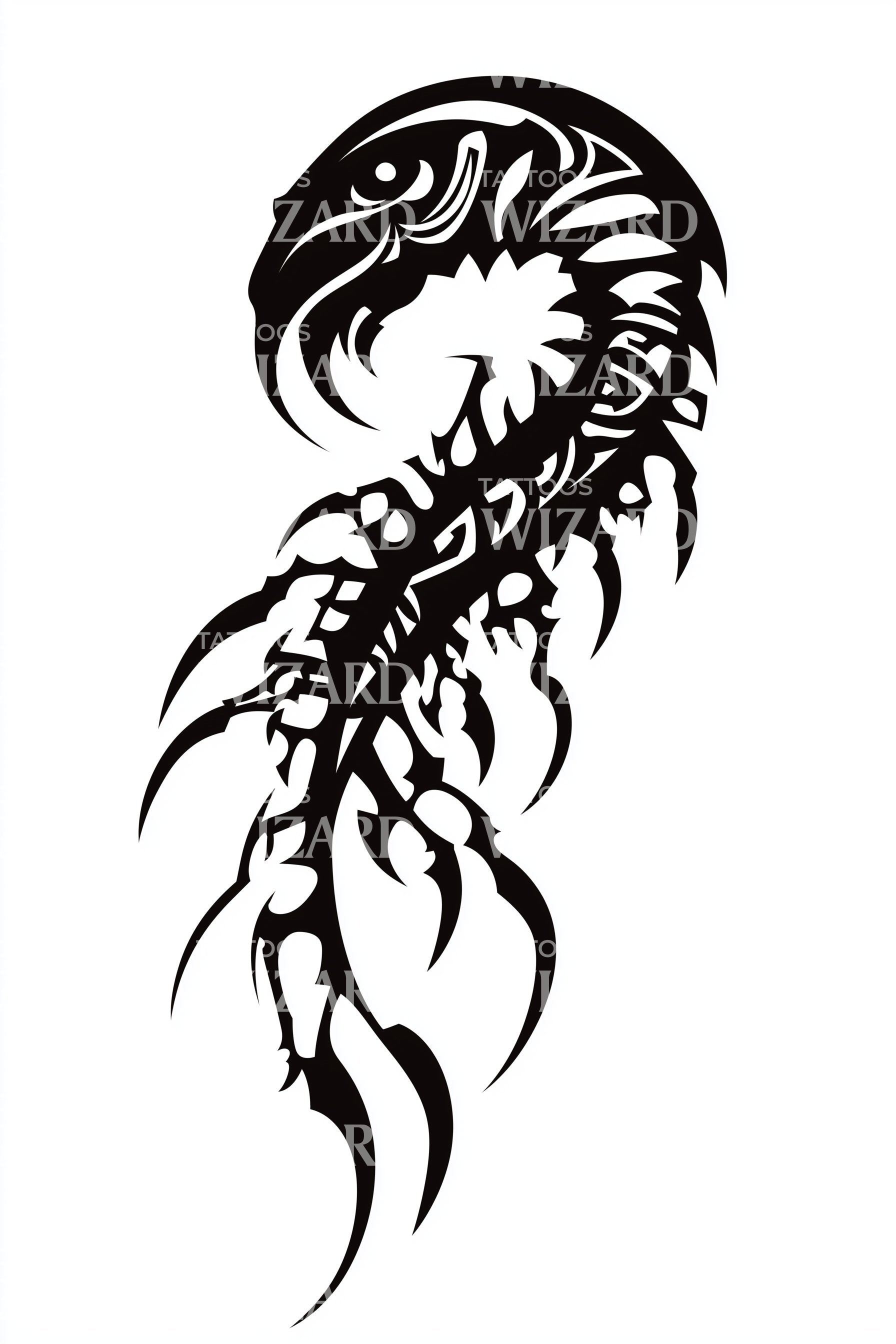 Unleash your oceanic spirit with this tribal seahorse tattoo design. A bold, black manifestation of traditional tribal artistry amalgamated with the sea's grace. The curves add a dynamic flow, encapsulating the ocean's profound mystery and your adventurous soul. An audacious way to express your affinity for the aquatic life.