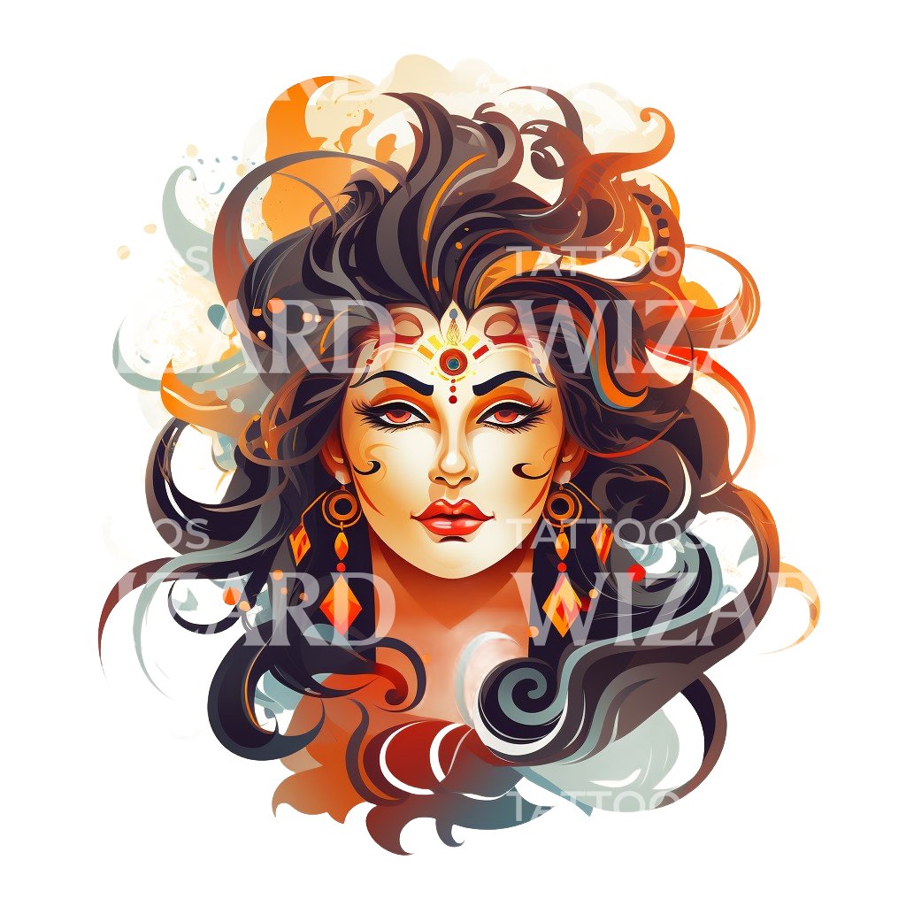 Immerse in Indian mythology with this Shiva Goddess portrait tattoo design. This illustrative masterpiece embodies the power and elegance of Shiva, the divine feminine. Its intricate details and bold strokes radiate an ethereal aura, making it a captivating tribute to the iconic Indian Goddess.