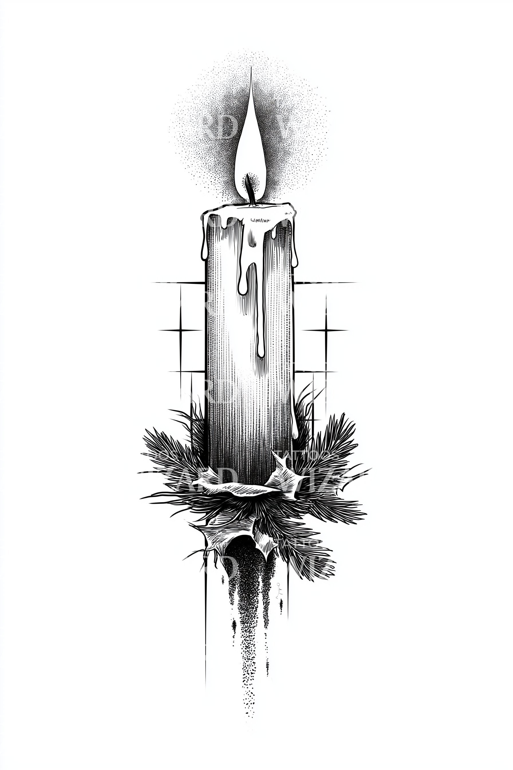 Fineline candle rises, its dotwork flame haloed above wax drips, framed by pine and holly with subtle star glints. Minimalist and serene, it symbolizes winter’s steady light, remembrance, and guidance through dark nights. Wearing it invites calm presence, quiet celebrations, and a personal promise to carry warmth.