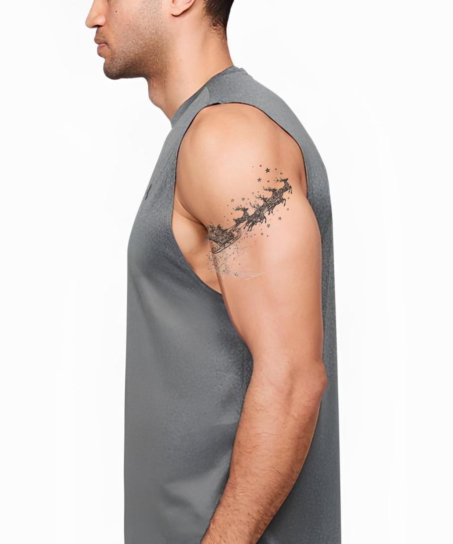Midnight blackwork etches Santa’s sleigh and soaring reindeer, trailed by star-sparks that arc like a comet. Constellations symbolize guidance, generosity, and wishes carried through winter. Sleigh lines speak of momentum and giving. Worn on skin, it feels like keeping Christmas magic close, uplifting wonder all year.