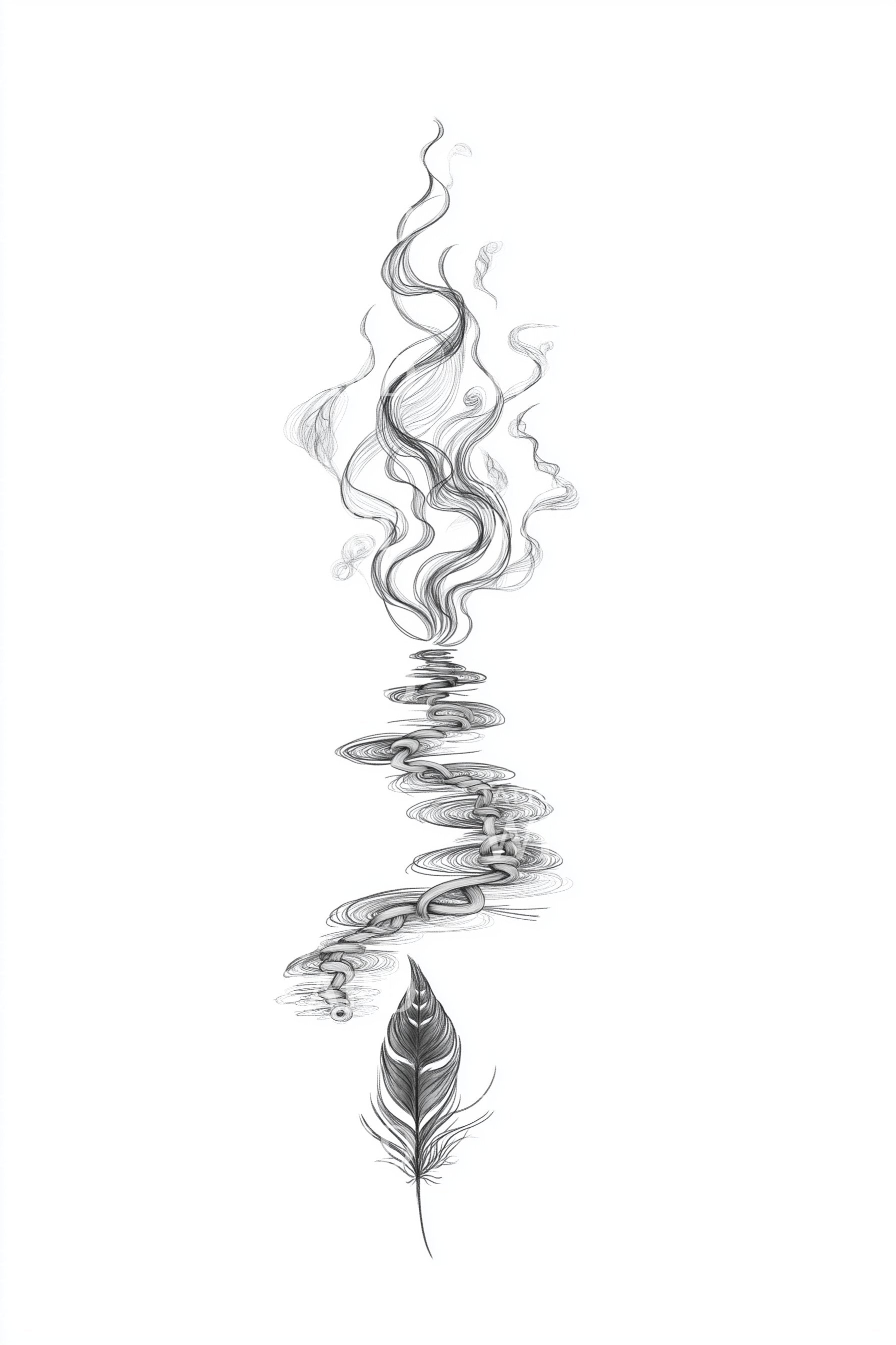 Feather-born smoke coils upward in a delicate pencil sketch, a spiral of ripples and tendrils that breathe with quiet motion. The feather grounds the spirit, while the ascending swirl symbolizes release, energy awakening, and transformation. Worn on skin, it feels ethereal, calming, and quietly powerful, like exhaled clarity.