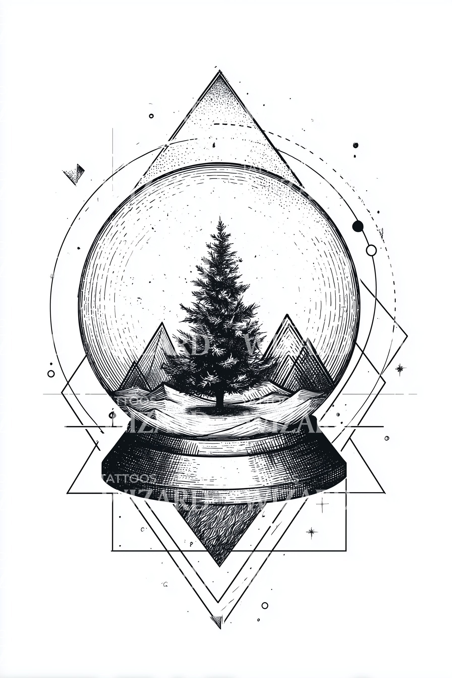 Snowglobe dream rendered in fine blackline: a lone evergreen rooted in winter drifts, held within luminous glass, framed by crisp triangles and planetary arcs. The tree symbolizes steadfastness through cold seasons; geometry evokes order. Worn daily, it whispers nostalgia, quiet resilience, and clear-hearted wonder with every passing season.