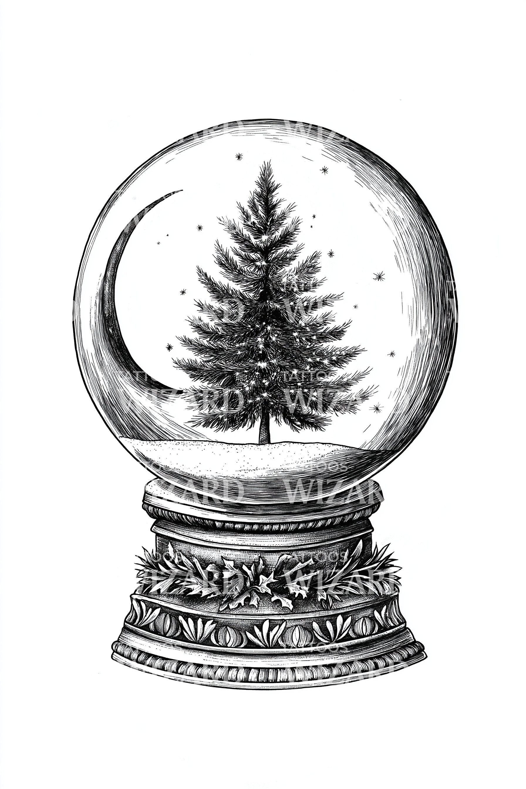 Snowglobe ink captures a moonlit pine tree within crystal glass, stars drifting above pristine snow, perched on an ornate holly pedestal. The evergreen symbolizes resilience and renewal, a quiet Christmas universe held still. Wearing it feels like pocketing winter magic, a tender reminder to protect wonder and believe.