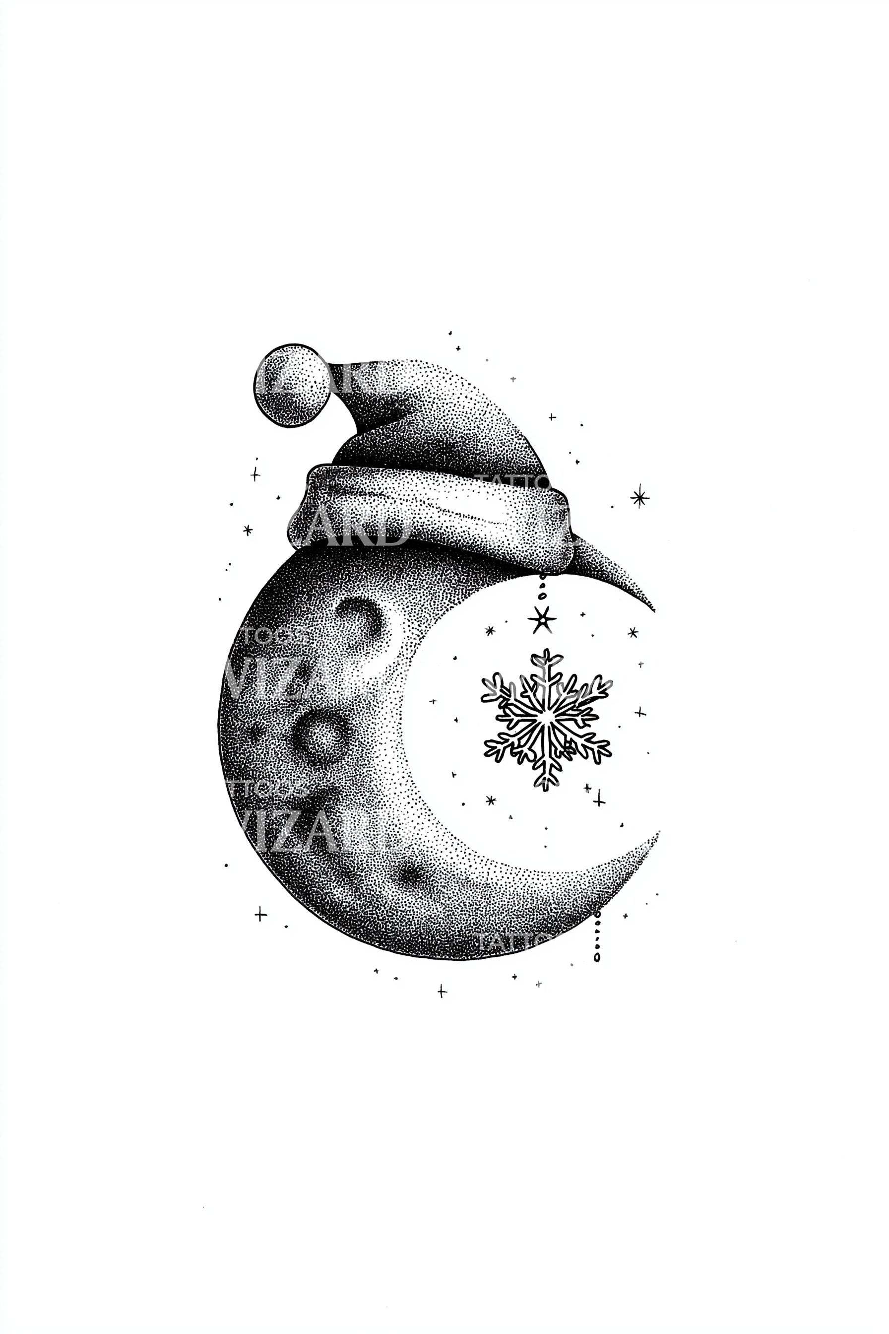 Stippled crescent moon wears a cozy snowman hat, twinkling amid tiny stars, while a delicate snowflake glows in its cradle. Dotwork texture gives lunar craters and winter hush. Symbolizing playful wonder, seasonal renewal, and quiet guidance through long nights, this design warms the wearer with nostalgic holiday joy.