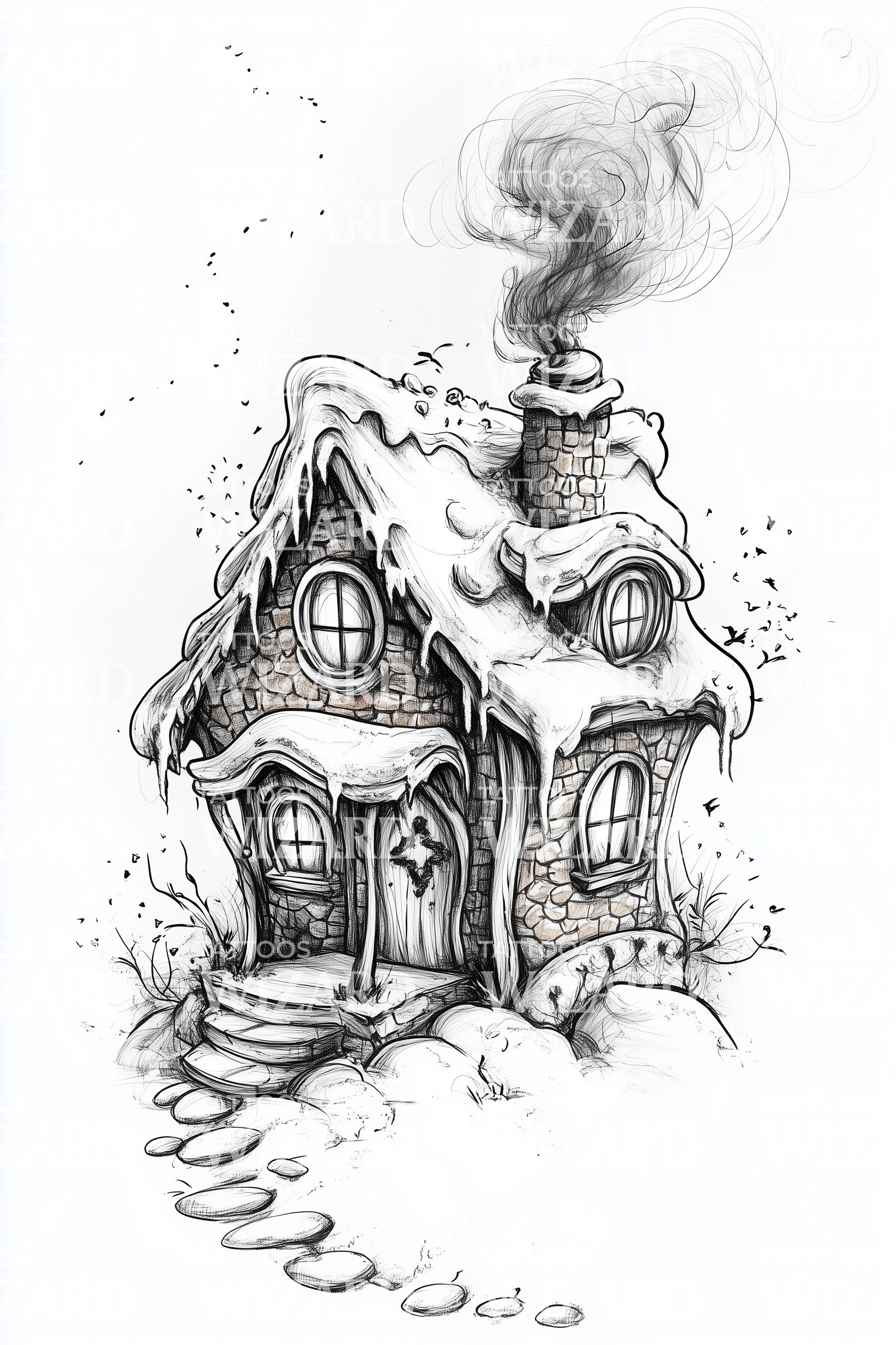 Ink-illustrated cottage slouches under sugared snow, round windows glowing while chimney smoke curls like whispered spells. Stones and drifted paths invite quiet steps. Symbol of hearth, refuge, and winter’s resilience, this design wraps the wearer in cozy fairytale calm, a talisman for home, warmth, and wonder.