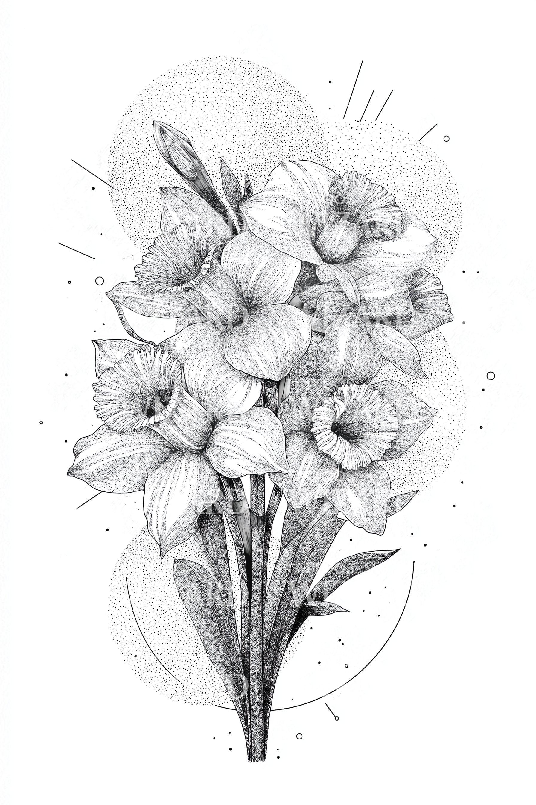 Immerse yourself in the world of realism with this delicate black & grey tattoo design. Featuring a beautifully intricate bouquet of daffodils in stunning detail, it exudes a floral elegance that is truly timeless. It's the perfect embodiment of grace for the discerning tattoo enthusiast.