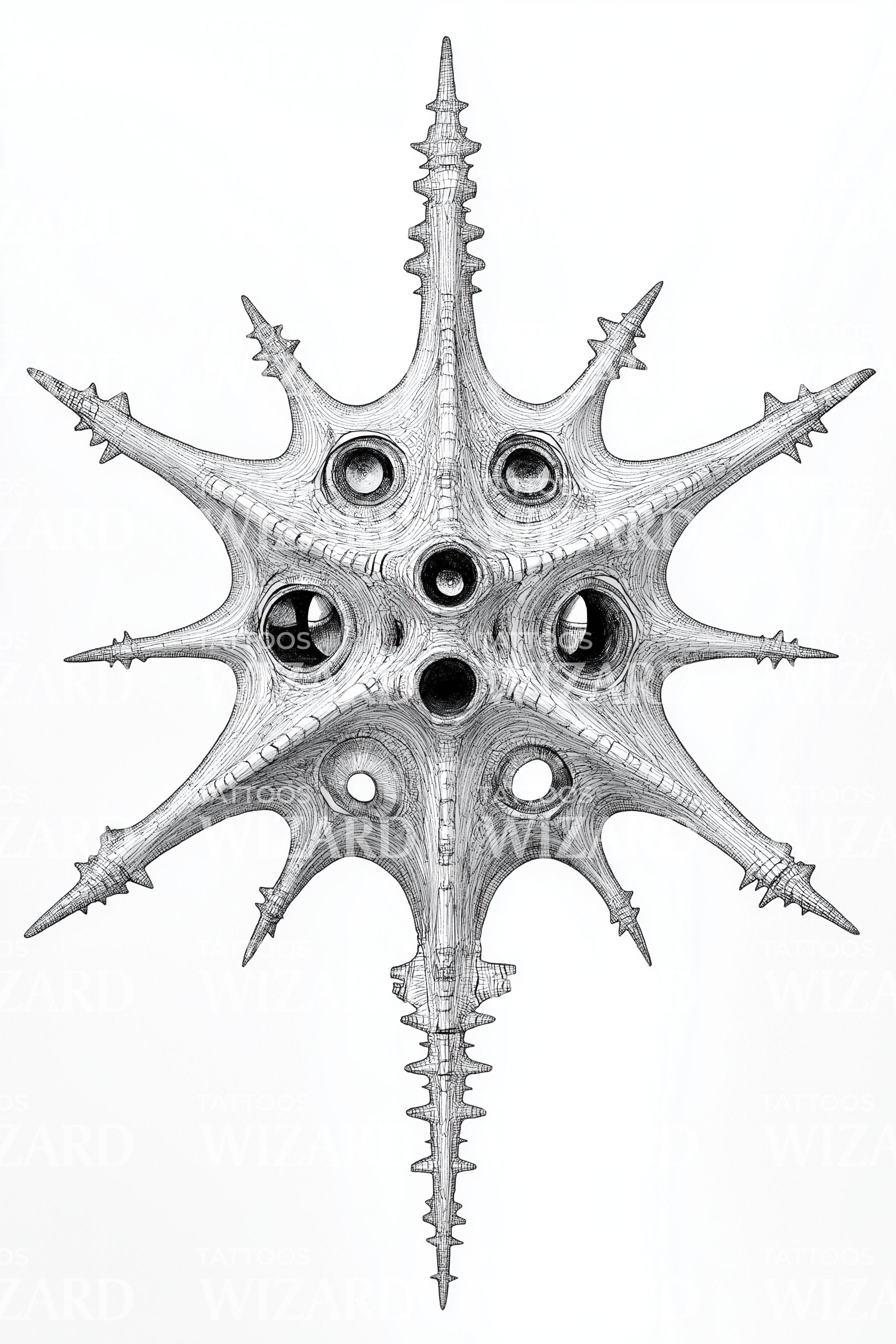 Radiolarian spine meets star logic, a marine relic of survival turned prayer. Micro dotwork insists that strength can be intricate, not loud. For the ones who feel alien in daylight yet steady in pressure, it says: I belong to the deep, and I guide myself.
