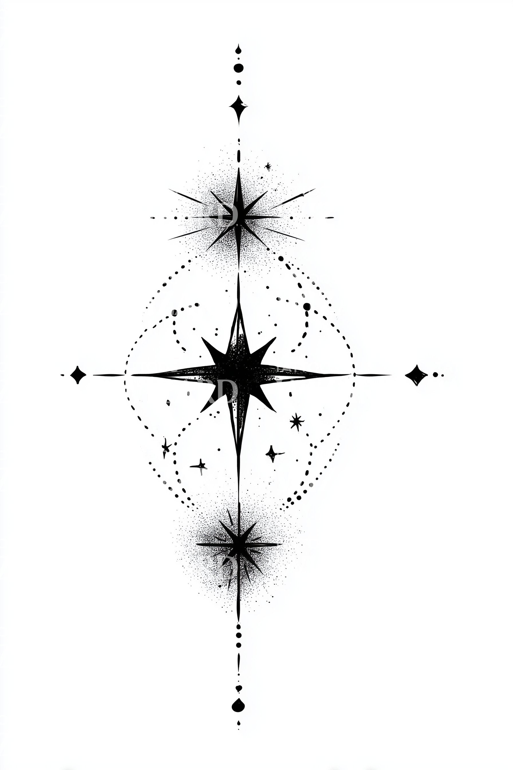 Immerse in the beauty of the cosmos with this dotwork tattoo design! Uniquely crafted, it features a stellar compass to symbolize guidance and navigation. A light-filled star adds intrigue, embodying the mesmerizing allure of the universe. Navigate life's journey with this stunning cosmic guide.