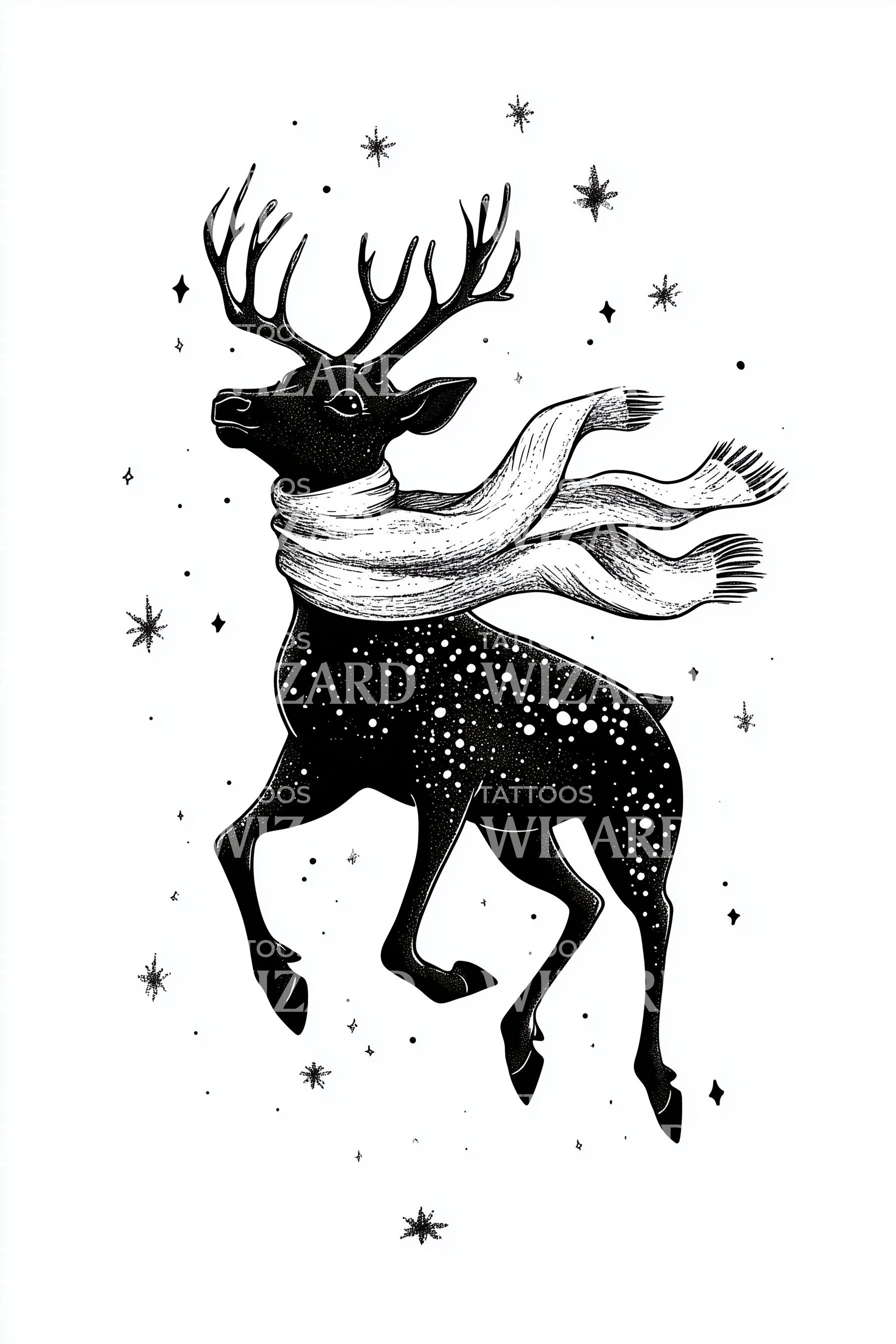 Midnight reindeer in crisp blackwork, antlers lifted, a wind-swept scarf trailing through star-salted night. Constellations freckle its coat, symbolizing guidance, endurance, and the warmth we carry through winter. Wearing this piece feels like traveling by inner North Star, hushed, brave, and wrapped in small, evergreen magic.