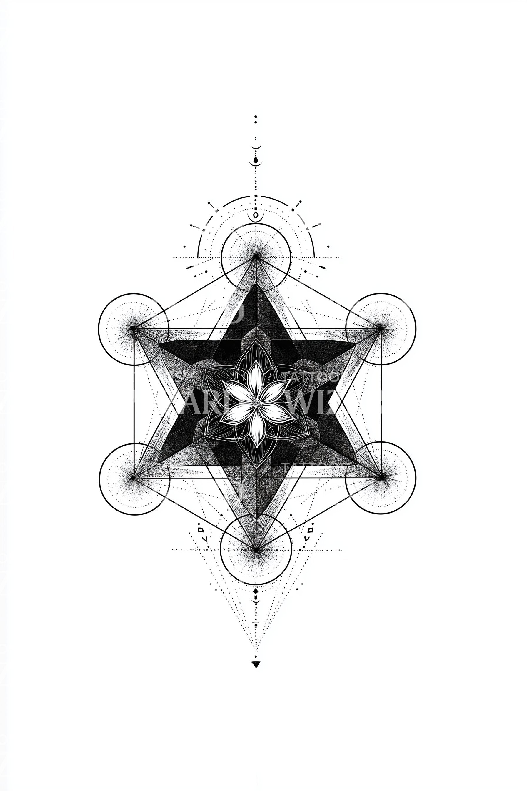 Unveil your inner spiritual sanctity with this geometric tattoo design, intricately combined with merkaba and star elements. It features a unique blend of geometry and mandala artistry, sequentially leading to a captivating floral pattern. An exceptional choice for those drawn towards symbolic and transformative body art.
