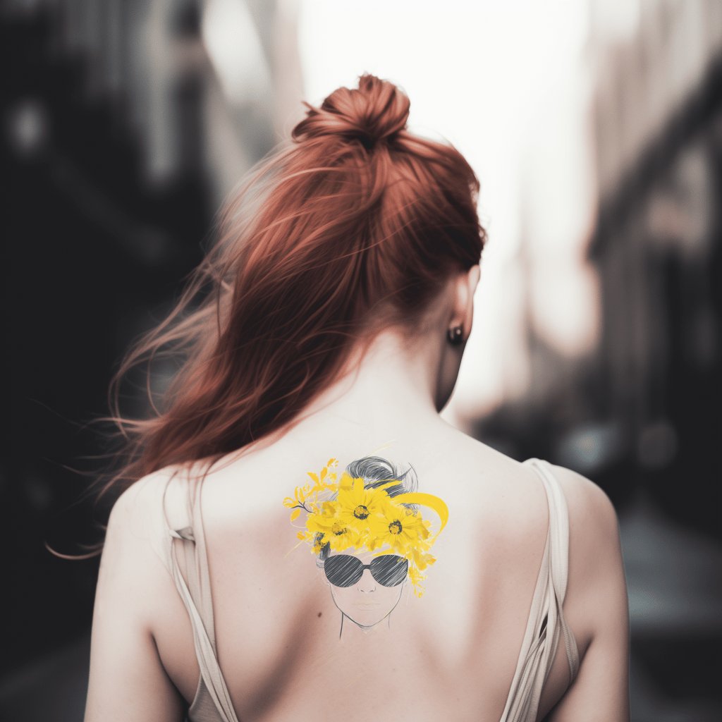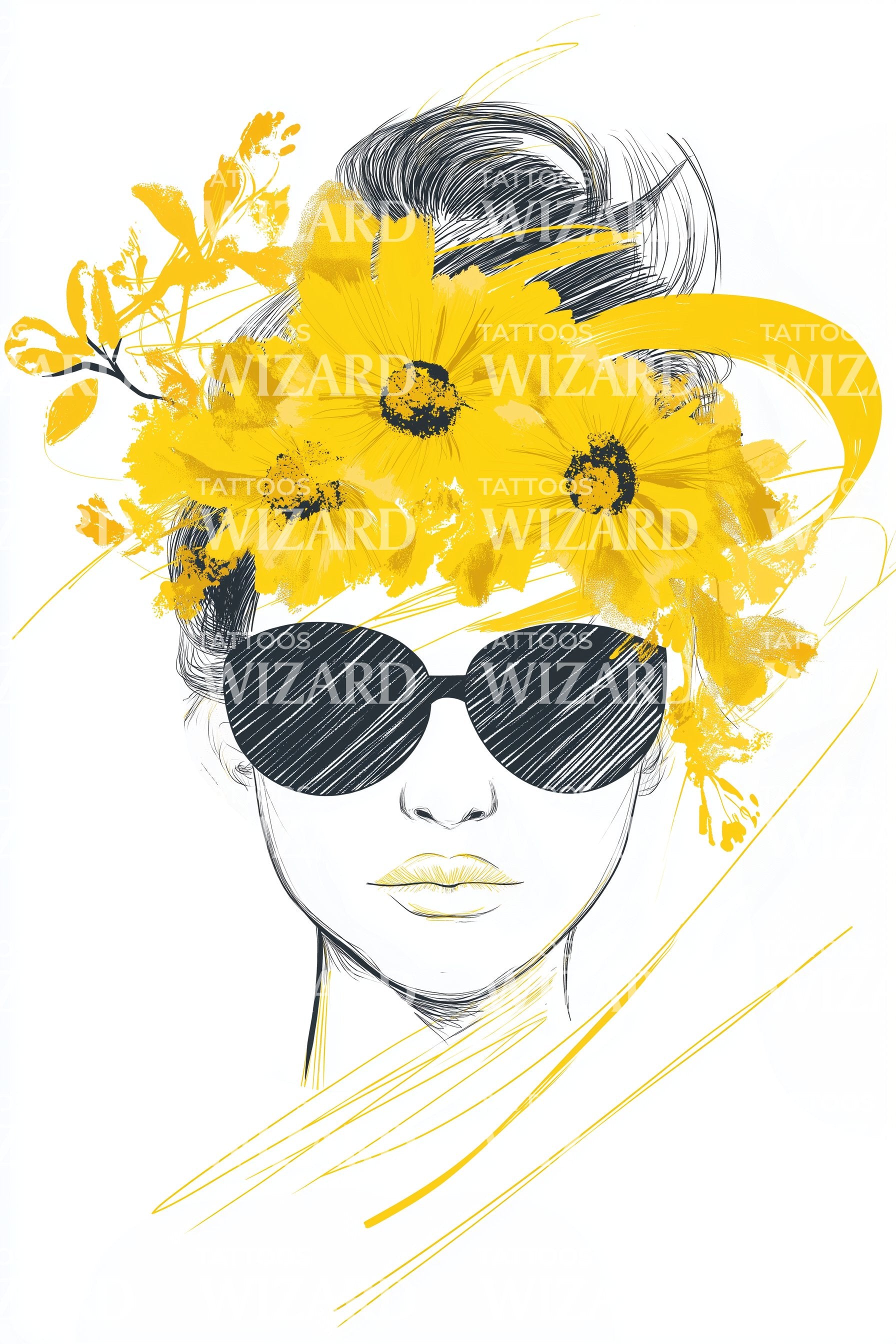 Bask in summer fashion with this illustrative tattoo design. It artistically exhibits a chic woman's portrait, beautifully accentuated with flowers and stylish glasses. Wear it as a statement of your love for femininity, nature, and timeless fashion trends. A perfect allure for that sunny vibe!