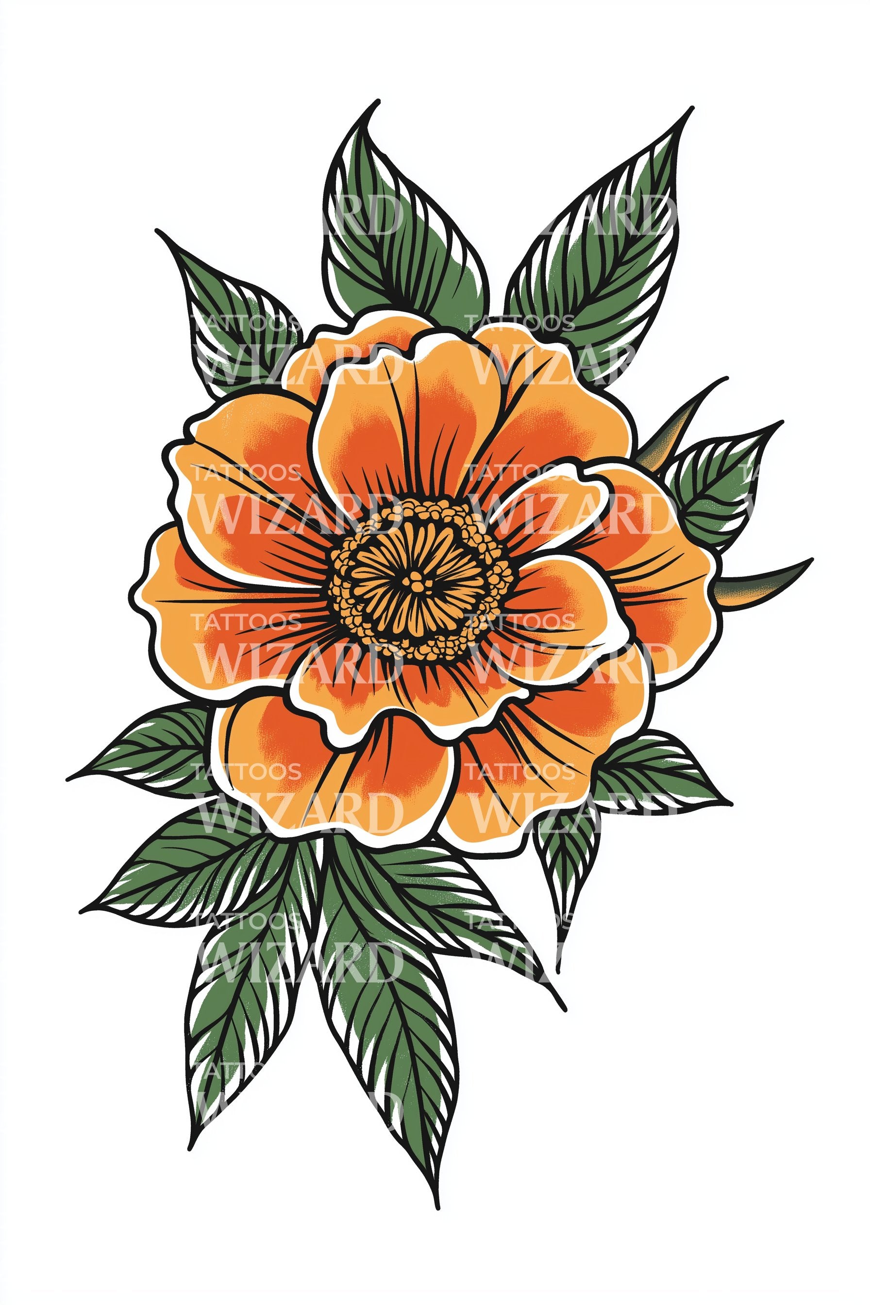 Experience the sublime fusion of classic and contemporary with this neotraditional tattoo design. The sunlit badge motif features a captivating peony surrounded by lush orange leaves. It's a vibrant homage to the timeless charm of the old while adding a unique twist, resonating with the pulse of today's aesthetics.