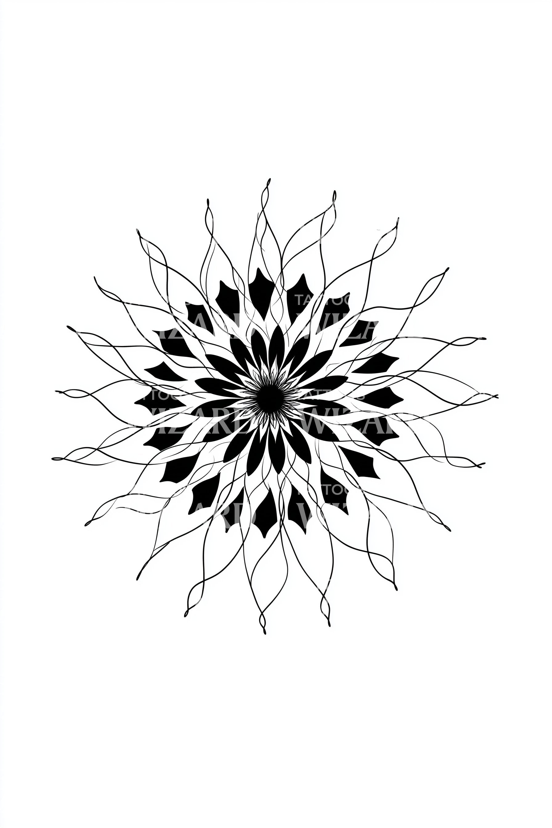 Radiant mandala of layered petals and flowing sunrays, mixing bold geometry with airy ornamental lines. Symbolizes vitality, balance, and the continual blossoming of self. Feels centering, warm, and quietly powerful. Ideal placements: sternum for inner sun, upper back for expanded rays, shoulder cap or forearm for natural flow.