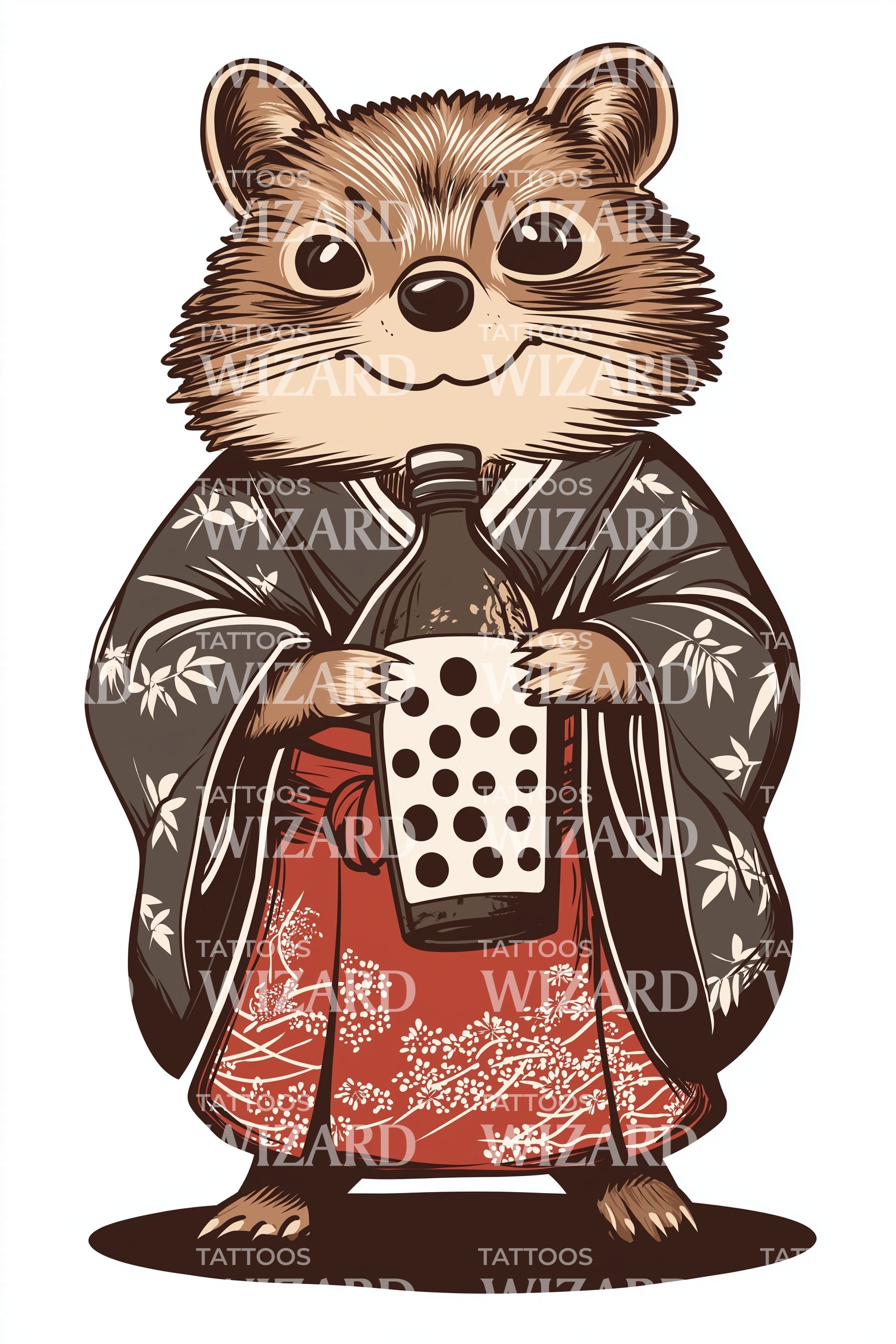 Warm-eyed tanuki in charcoal kimono and obi holds dotted tea flask, rendered in woodblock lines. Symbol of luck, thrift, playful transformation, inviting fortune and joy. Feels like a cute teatime companion. Ideal placements: forearm for flow, calf for balance, upper arm for bold read, shoulder blade for charm.