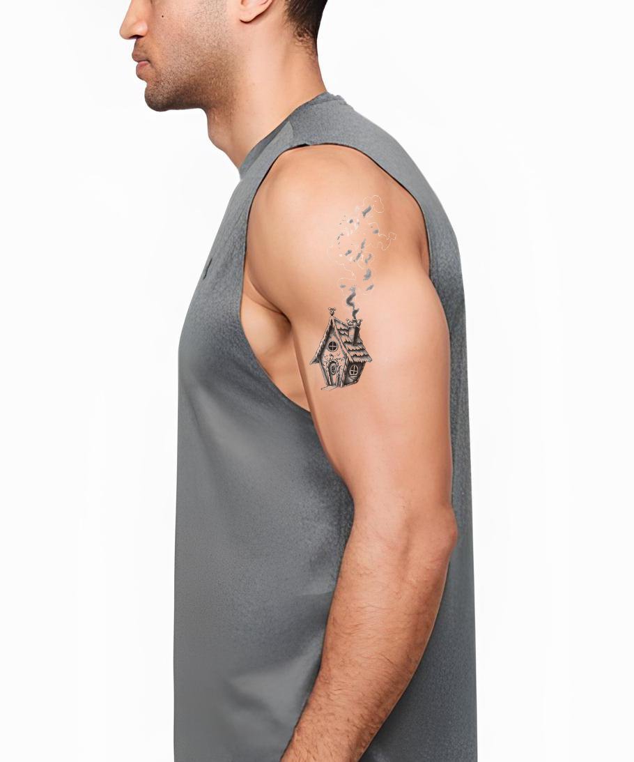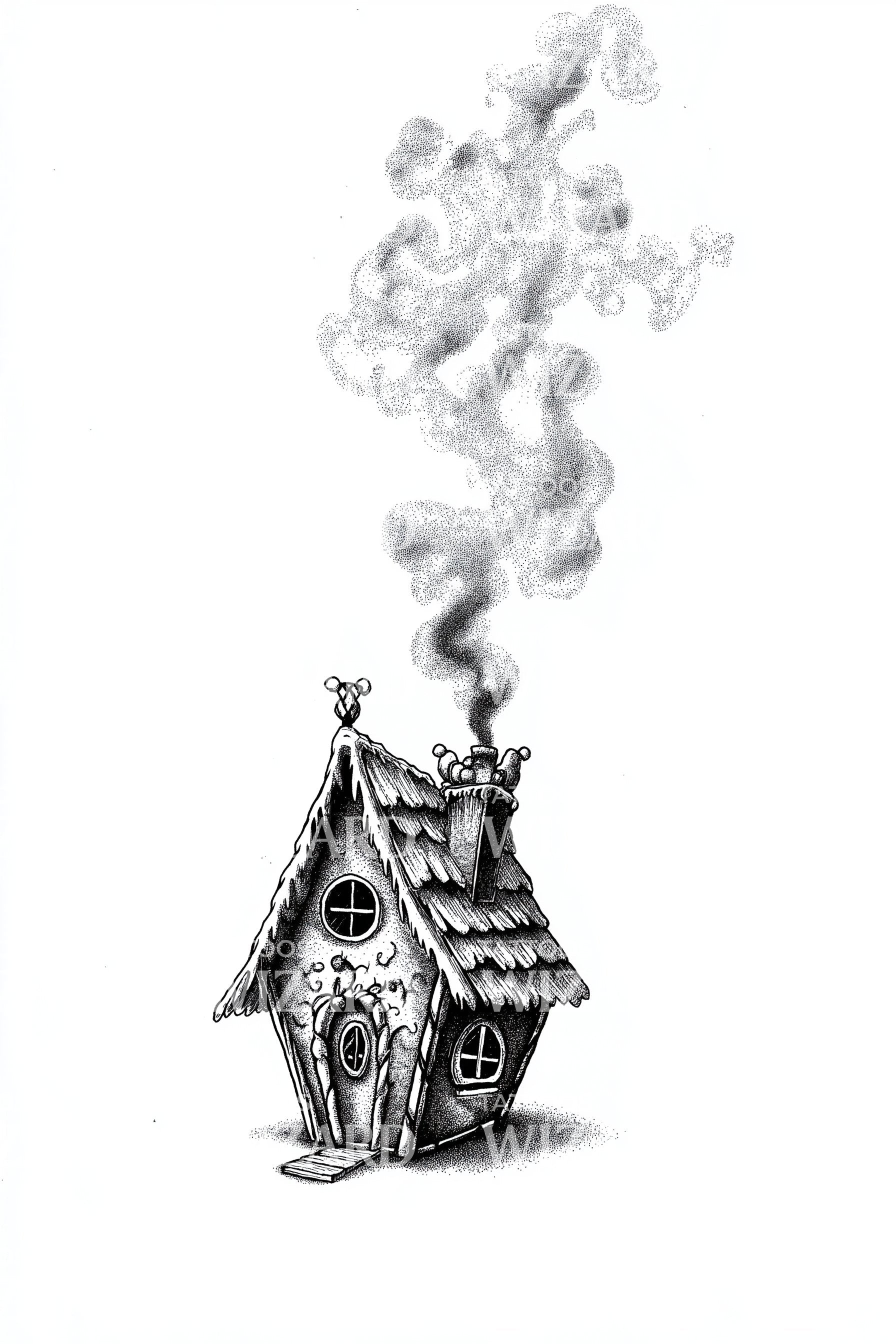 Tiny fineline cottage rises with delicate stipple shading, crooked roof and round windows, a tall chimney breathing soft winter smoke. Symbol of hearth, resilience, and chosen roots, it celebrates smallness as strength. Wearer feels tucked inside warmth and wonder, carrying home’s glow through every cold season and storms.