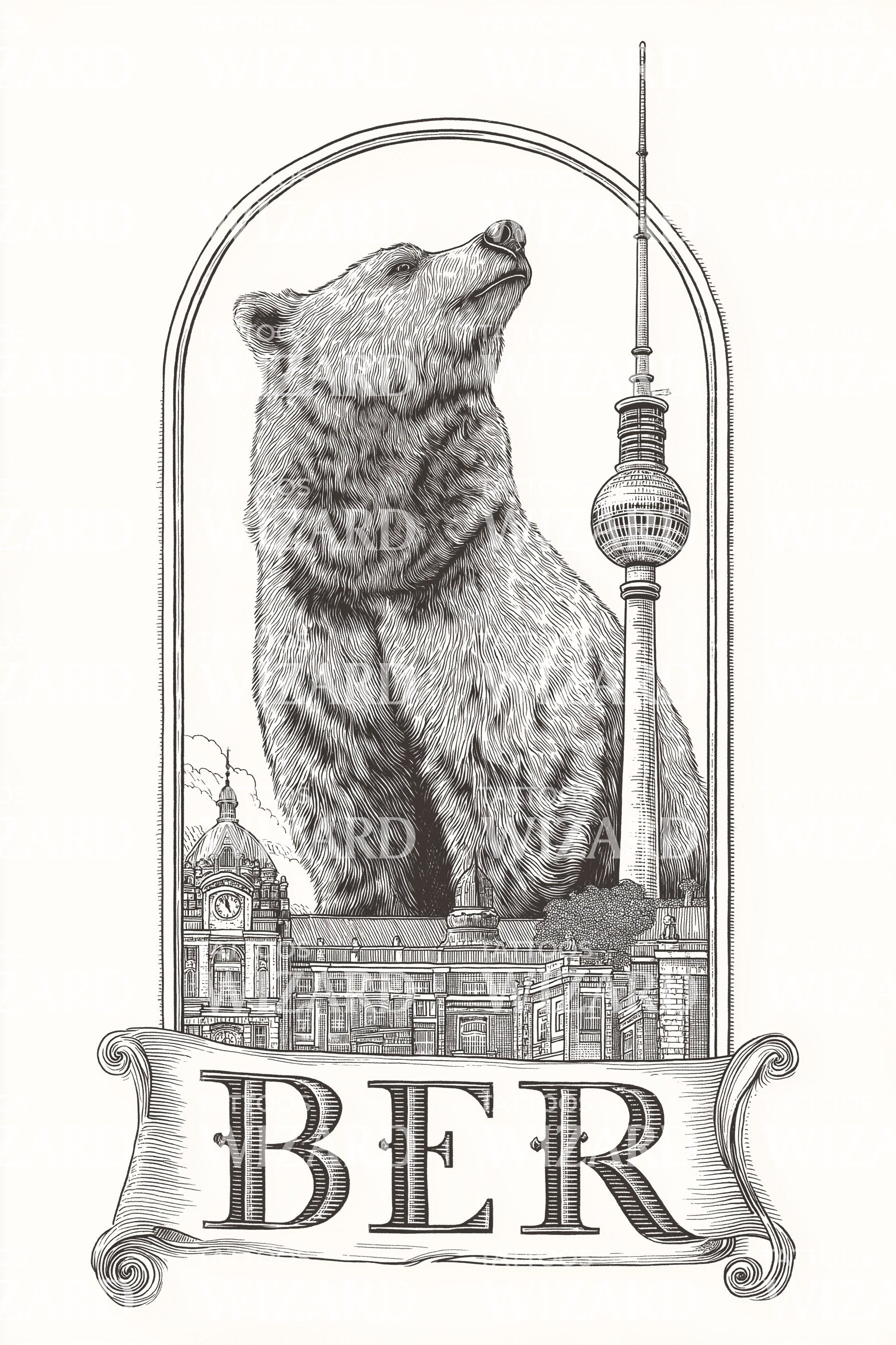 Fine-line black and grey etching frames a proud bear towering beside the Fernsehturm, city facades and a BER scroll beneath. Icon and animal merge into a vigilant monument, embodying Berlin’s resilience, curiosity, and rebirth. Wearing it feels like carrying streets, sky, and courage, a steadfast compass to home.