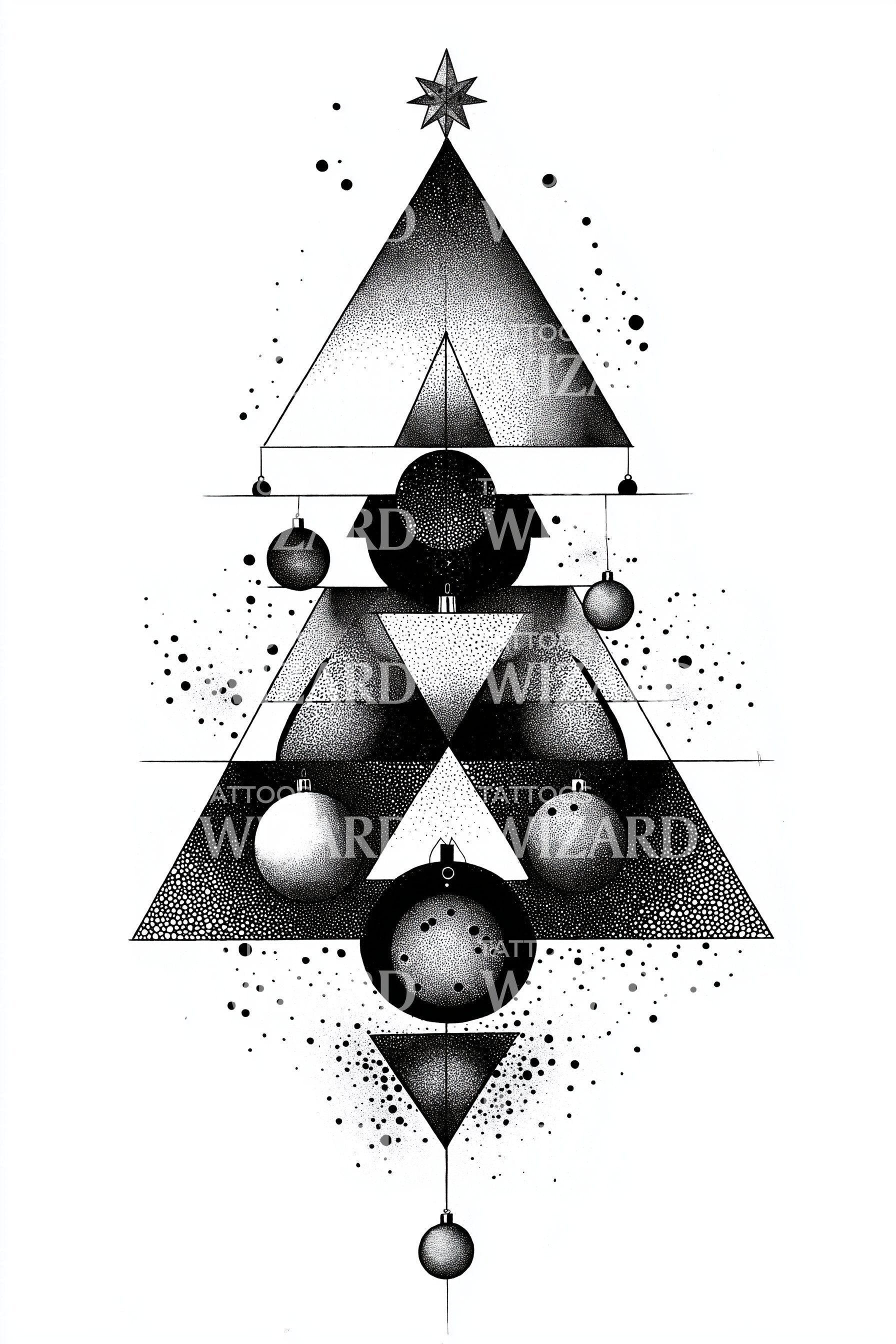 Starlit geometry gathers into a modern Christmas tree, rendered in meticulous dotwork. Layered triangles form branches, baubles float on fine lines, and cosmic speckles drift like winter hush. Symbolizing renewal, balance, and joy, this piece feels grounding yet festive, inviting quiet wonder and year-round celebratory spirit.