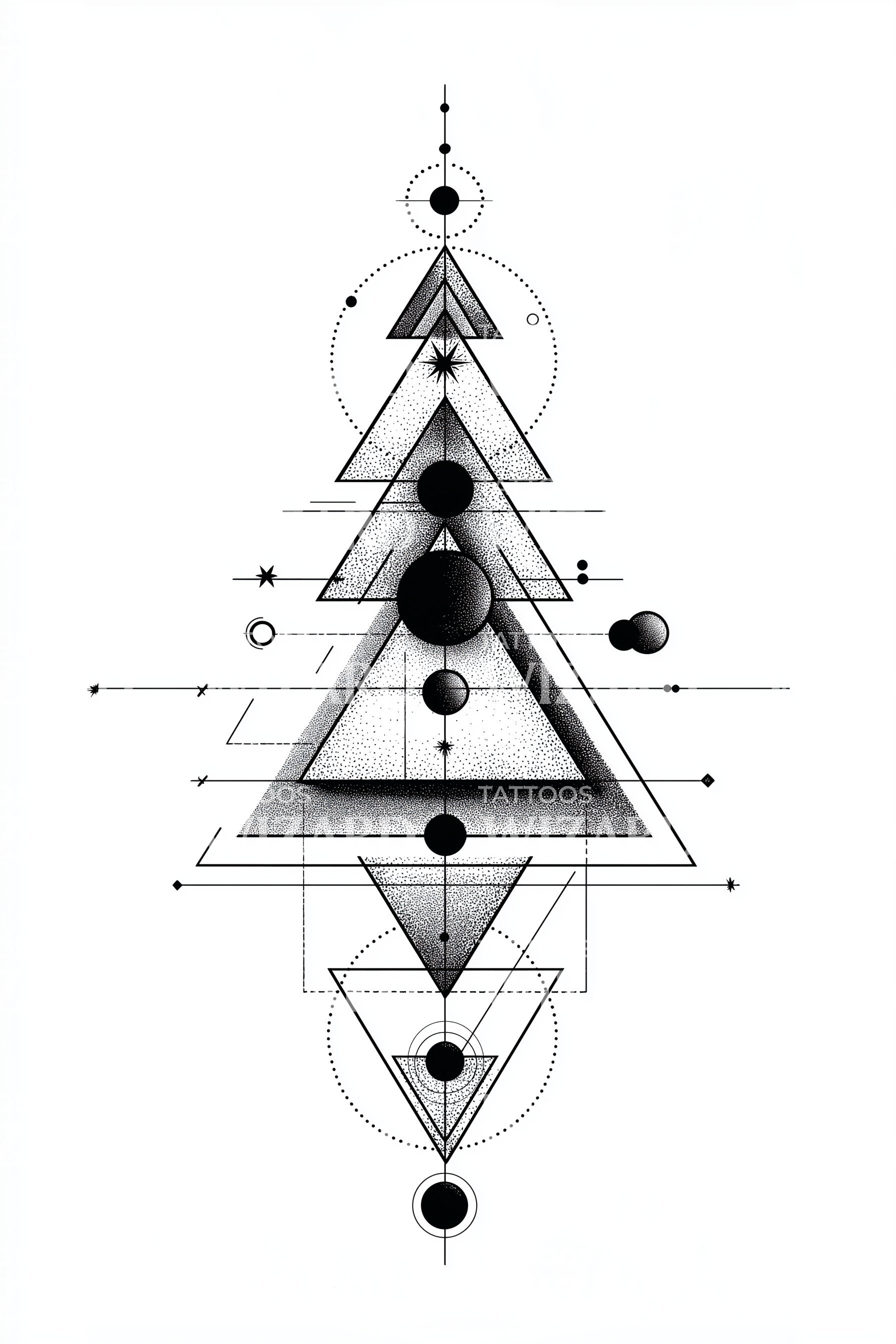 Geometric tree of nested triangles and orbiting dots, rendered in crisp black stipple. Each triangle marks growth, each circle a season, aligning nature with cosmos. A minimal, festive emblem of renewal and balance. Worn, it feels centered, modern, quietly celebratory, like steady light in winter and hopeful beginnings.