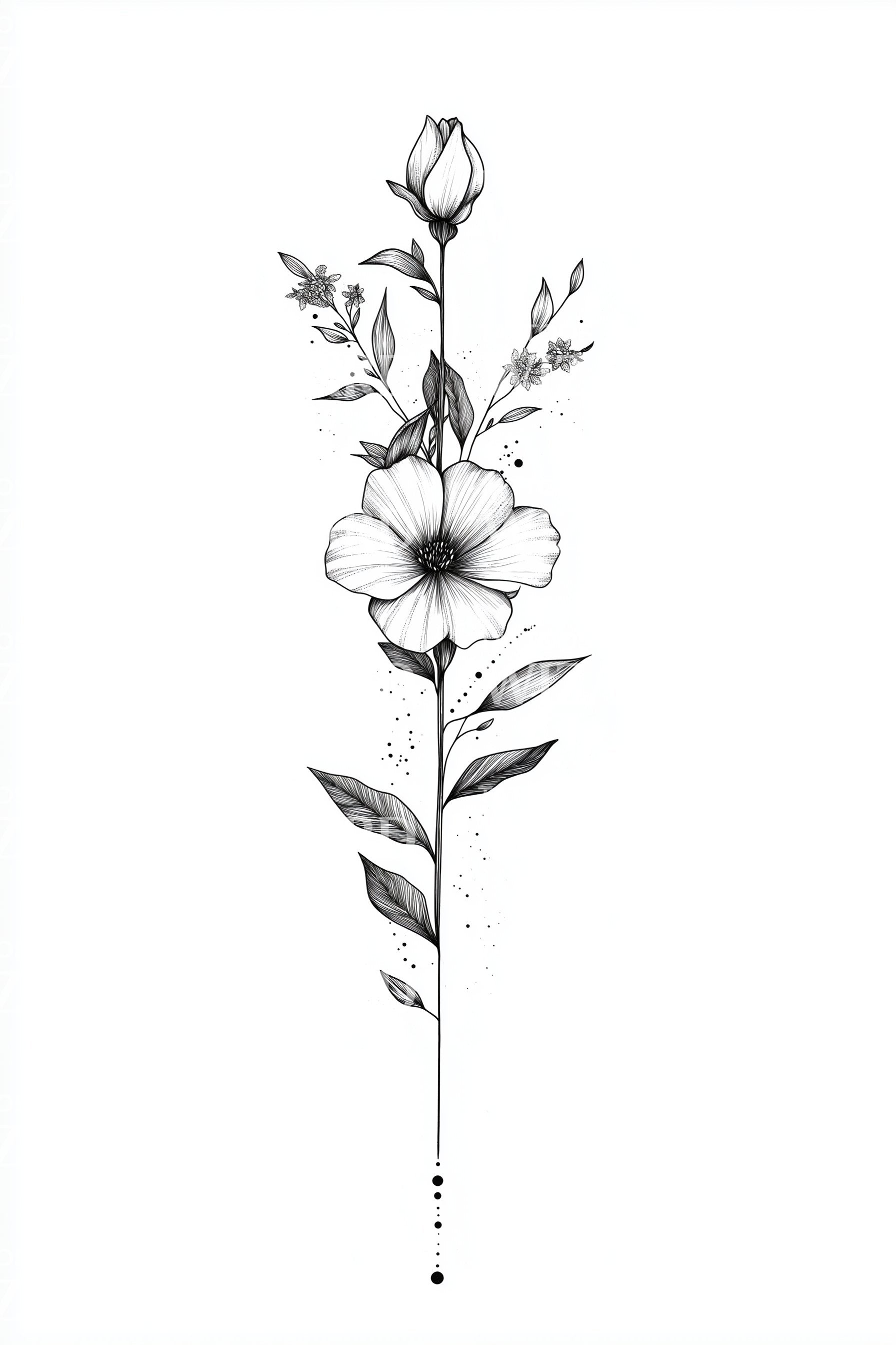 This elegant fineline tattoo design showcases a delicate bouquet of beautifully etched flowers. Arranged vertically to draw the eye upward, the design is emphasized with intricate stems. Radiating with sleek sophistication, it's the perfect expression of natural beauty and elegance.