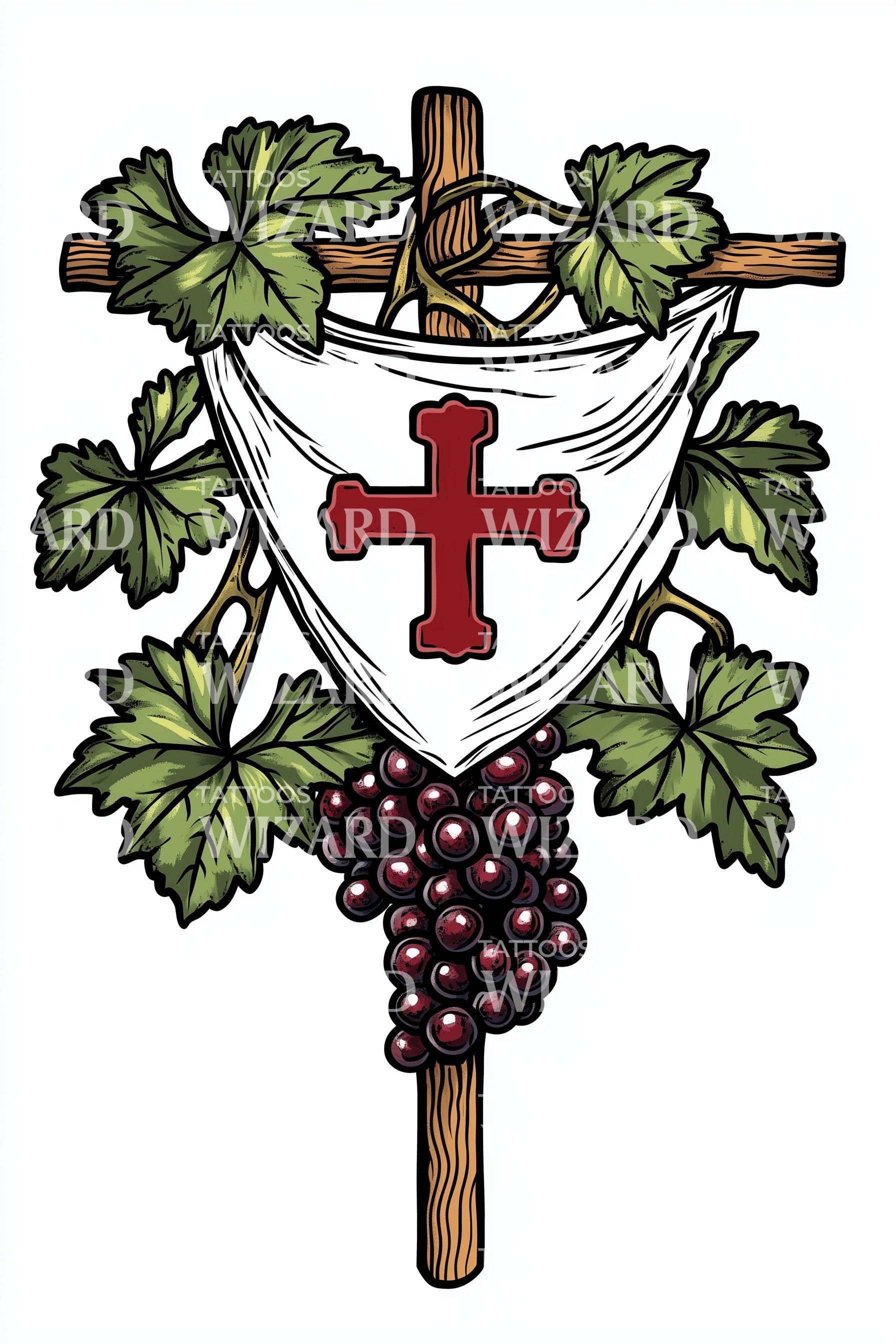 Featuring a unique blend of Georgian motifs, this ornamental tattoo design beautifully intertwines wine, grapes, a cross, and vine imagery in a captivating tapestry that echoes Georgia's flag. A vivid expression of faith and viticulture, this piece invites you to carry a piece of Georgia on your skin.