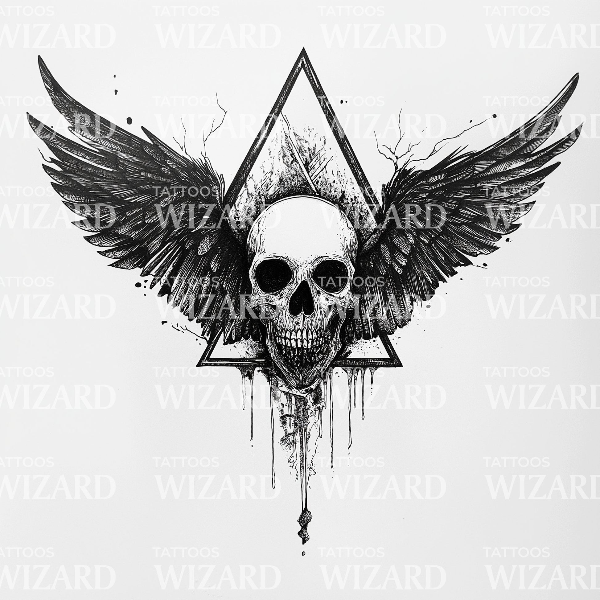 Unleash your dark mysticism with our black and grey tattoo design, featuring a skull encased within a foreboding triangle. Flanked by majestic wings, this design carries a profound occult symbolism, perfect for those fascinated by the esoteric and the macabre. Dare to bare your enigmatic aura with this indelible art piece.