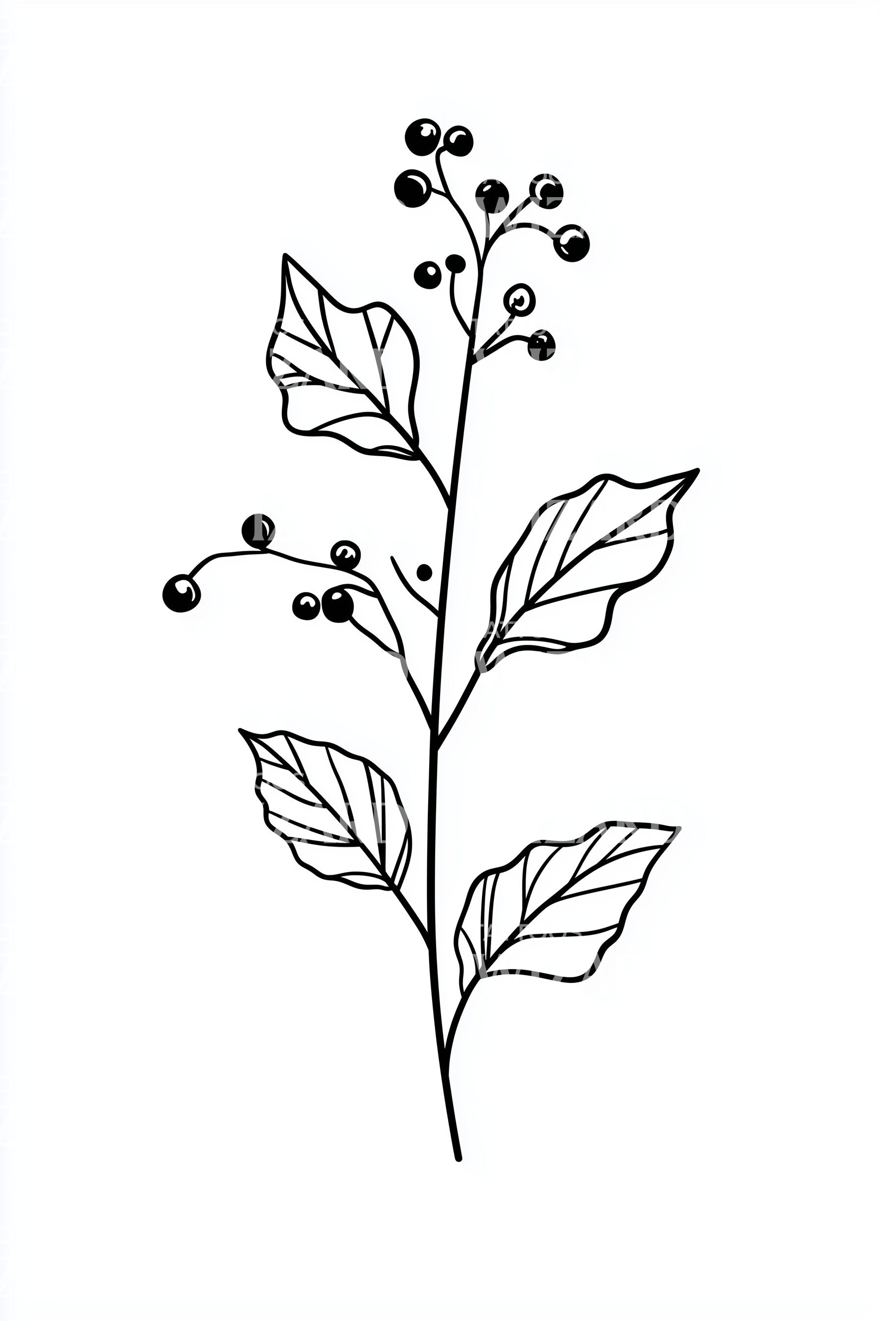 Winter floral sprig in fine black linework, a slender stem lifting veined leaves and glossy berries. Symbol of endurance and gentle abundance, it honors life that ripens in the cold. Wearer feels calm, grounded, and quietly brave, carrying a delicate vow of renewal, grace, and botanical poetry.