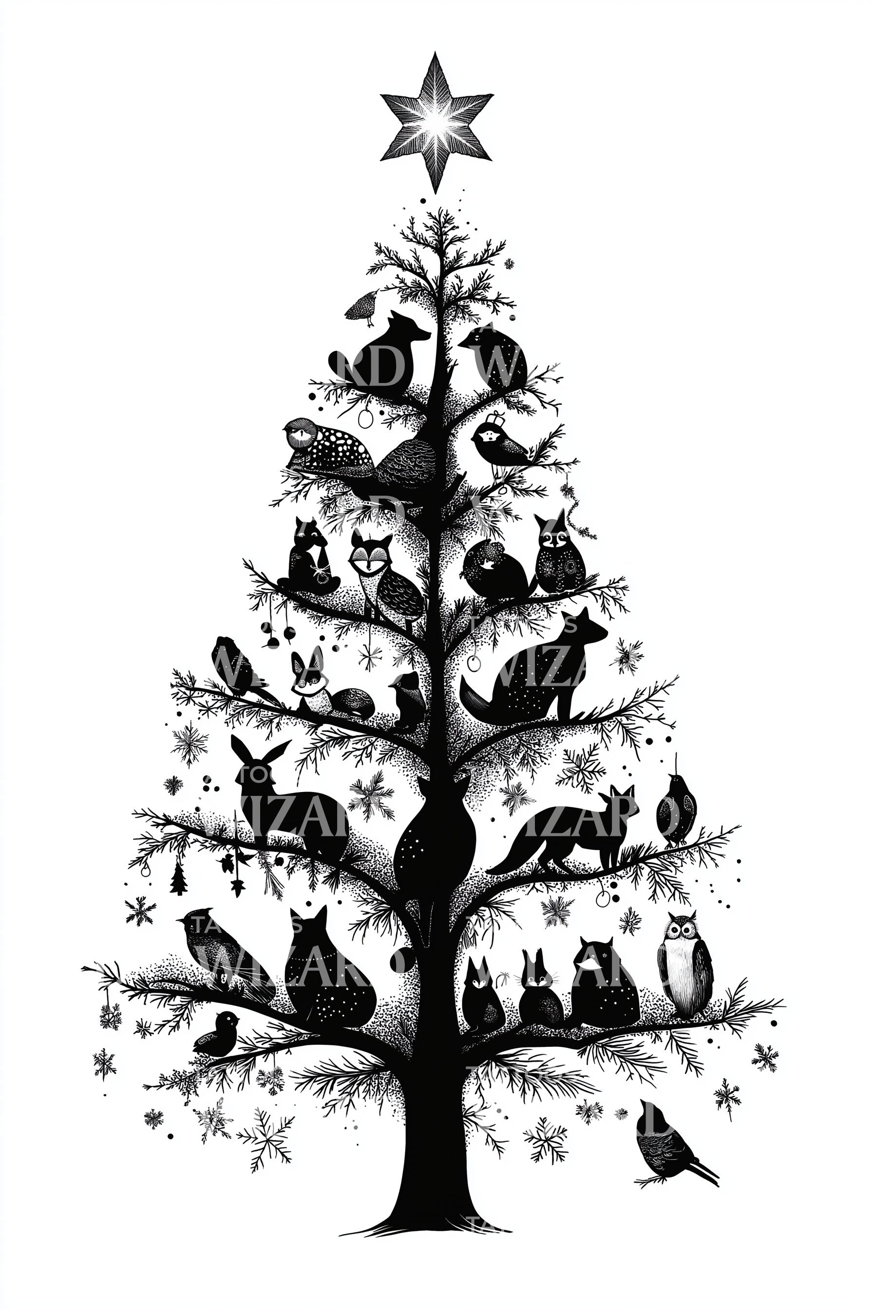 Midnight-black fir rises with spare branches, a Christmas star crowning its tip, forest creatures nested in crisp blackwork silhouette. Ravens perch like inked omens. The evergreen symbolizes endurance; ravens carry messages between shadow and wonder, honoring quiet community. Wearing it feels protective, minimal, winter-calm, quietly hopeful, grounded in stillness.