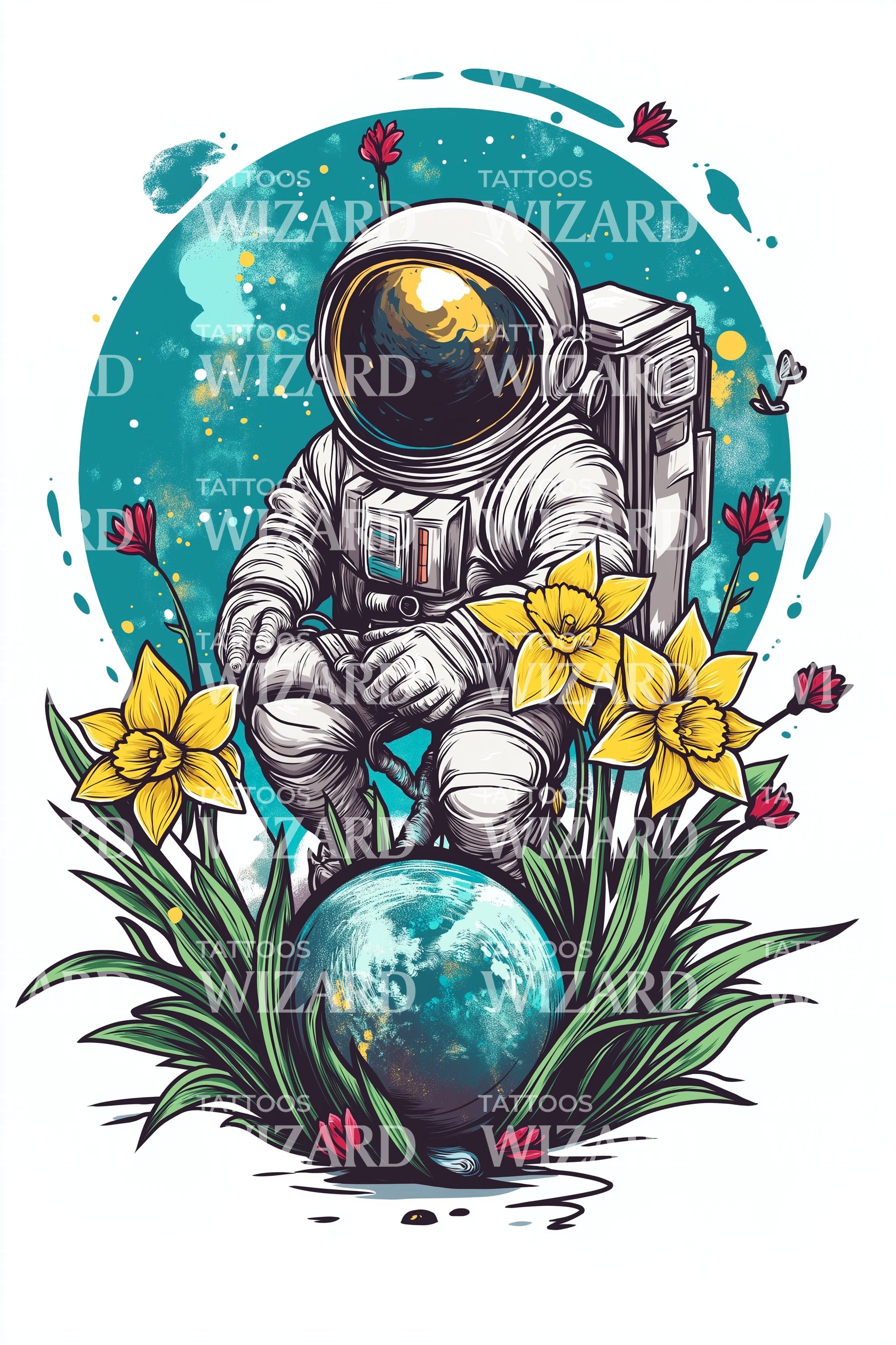 Injeta um toque de fantasia cósmica na tua arte corporal com este design de tatuagem newschool, apresentando uma fusão ilustrativa e onírica de astronauta e narciso. Situado contra o fascinante cenário do espaço, este design de flor primorosamente elaborado encapsula o delicado equilíbrio entre a exploração celestial e a beleza terrestre.