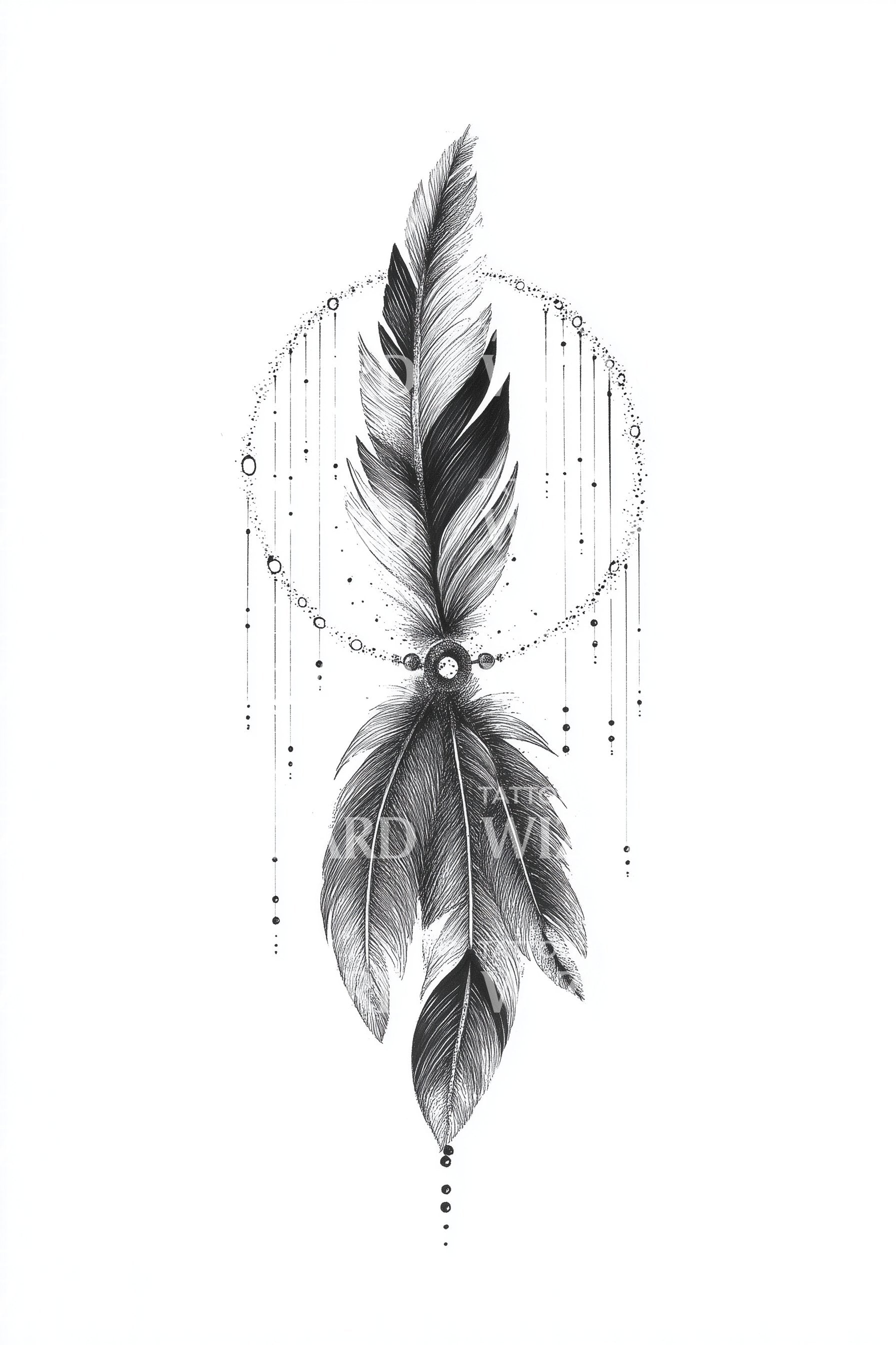 Vertical fineline feathers rise through a halo of dotwork, threaded with tiny beads and delicate drips. Ornamental yet airy, this boho sigil speaks of freedom, messages carried on the wind, and gentle protection. Wearing it feels grounded and uplifted, elegant grace meeting wanderer spirit, softly guiding forward.