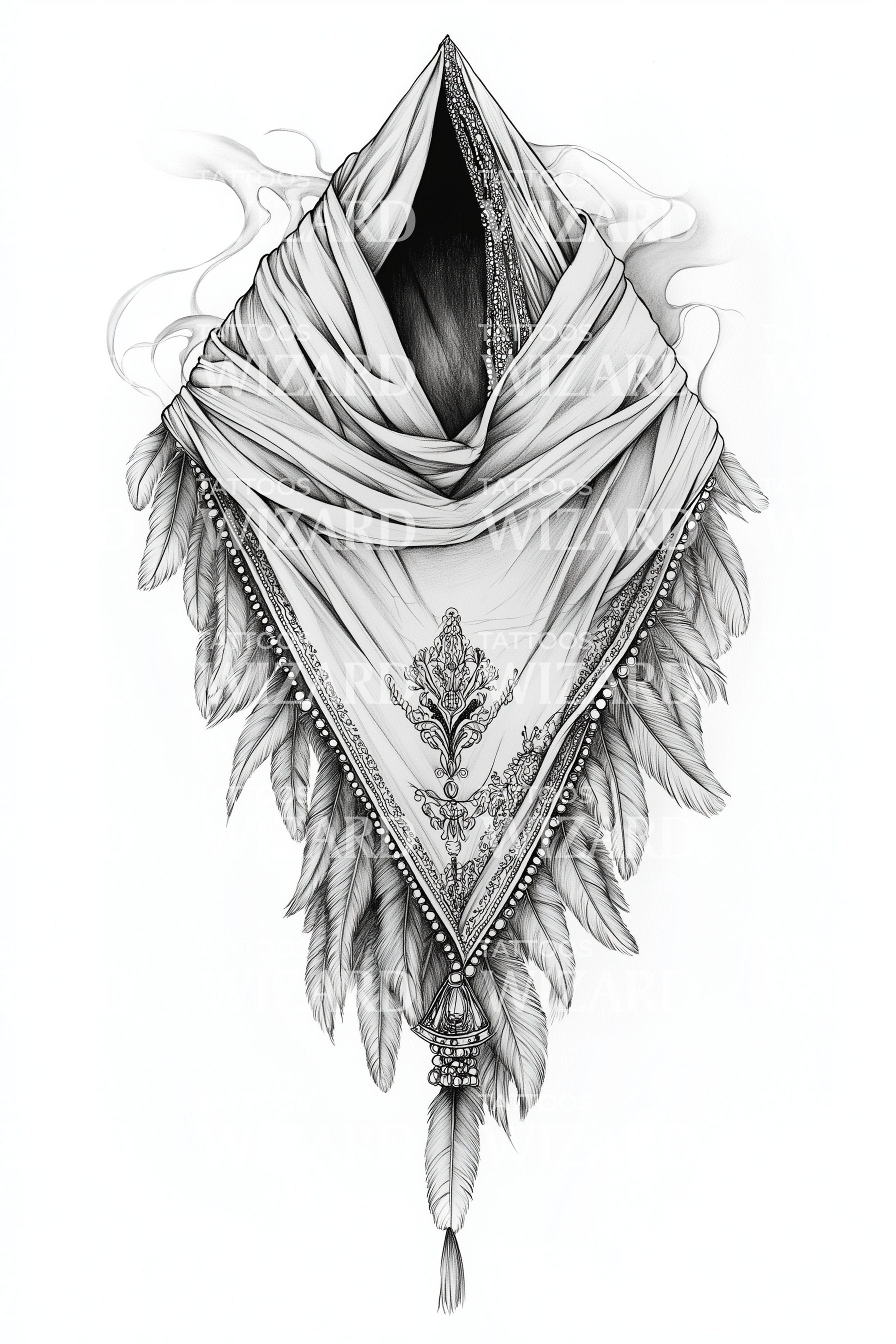 Boho guardian shawl rendered in layered ink, draped fabric cradled by bead-lined edges and a halo of feathers, tassel softly anchoring the point. Ornamental filigree marks the heart, a talisman of protection and passage. Wearer feels cloaked in calm, traveling light, grounded, quietly unstoppable, buoyed by ancestral stories.