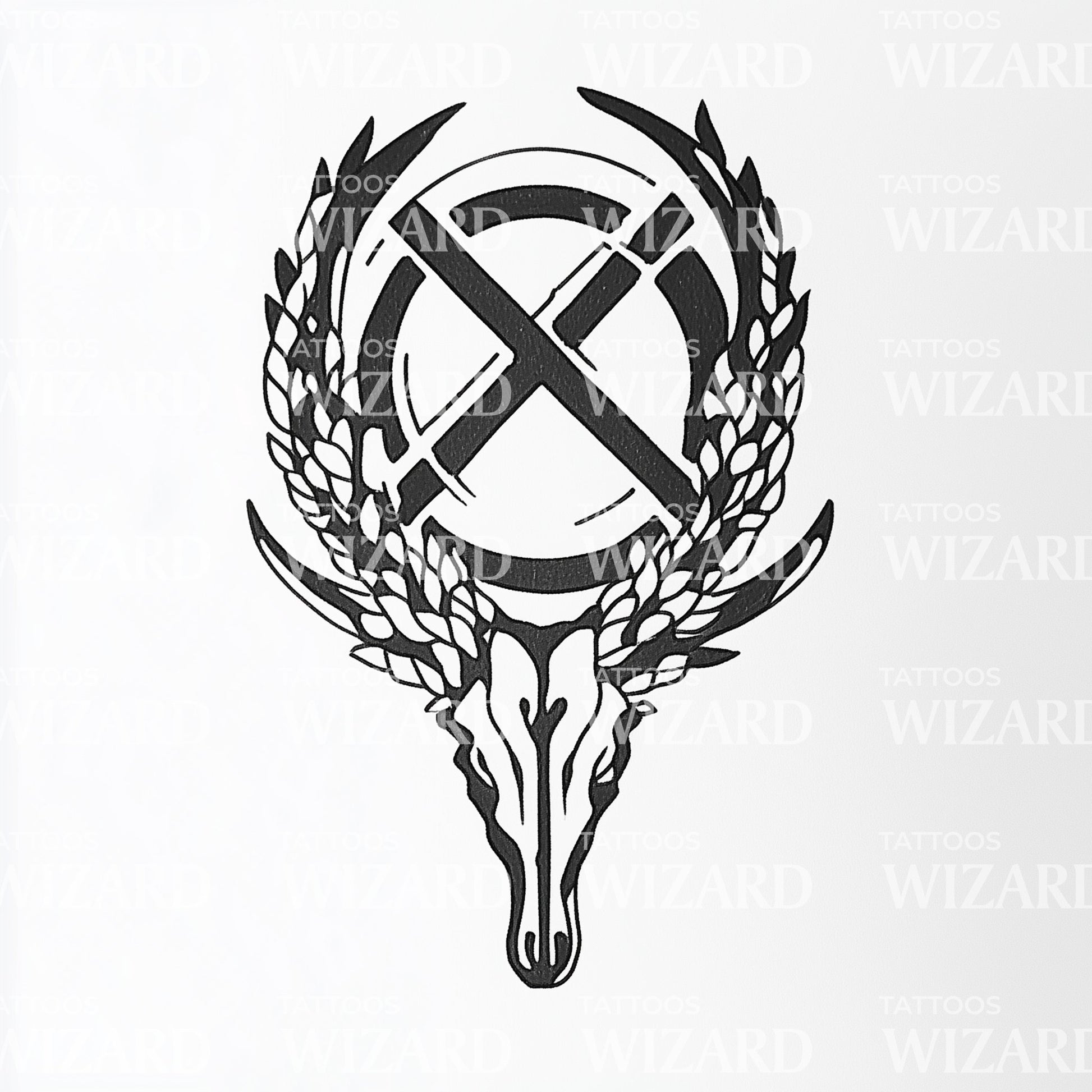 Mergulhe no simbolismo da revolução com este design de tatuagem blackwork. Une de forma única a estética tribal com uma intrigante ilustração de crânio de búfalo. É mais do que arte corporal, é uma peça que inicia conversas e reflete o seu espírito audaz e aventureiro. Assuma a sua narrativa hoje com esta peça fascinante.
