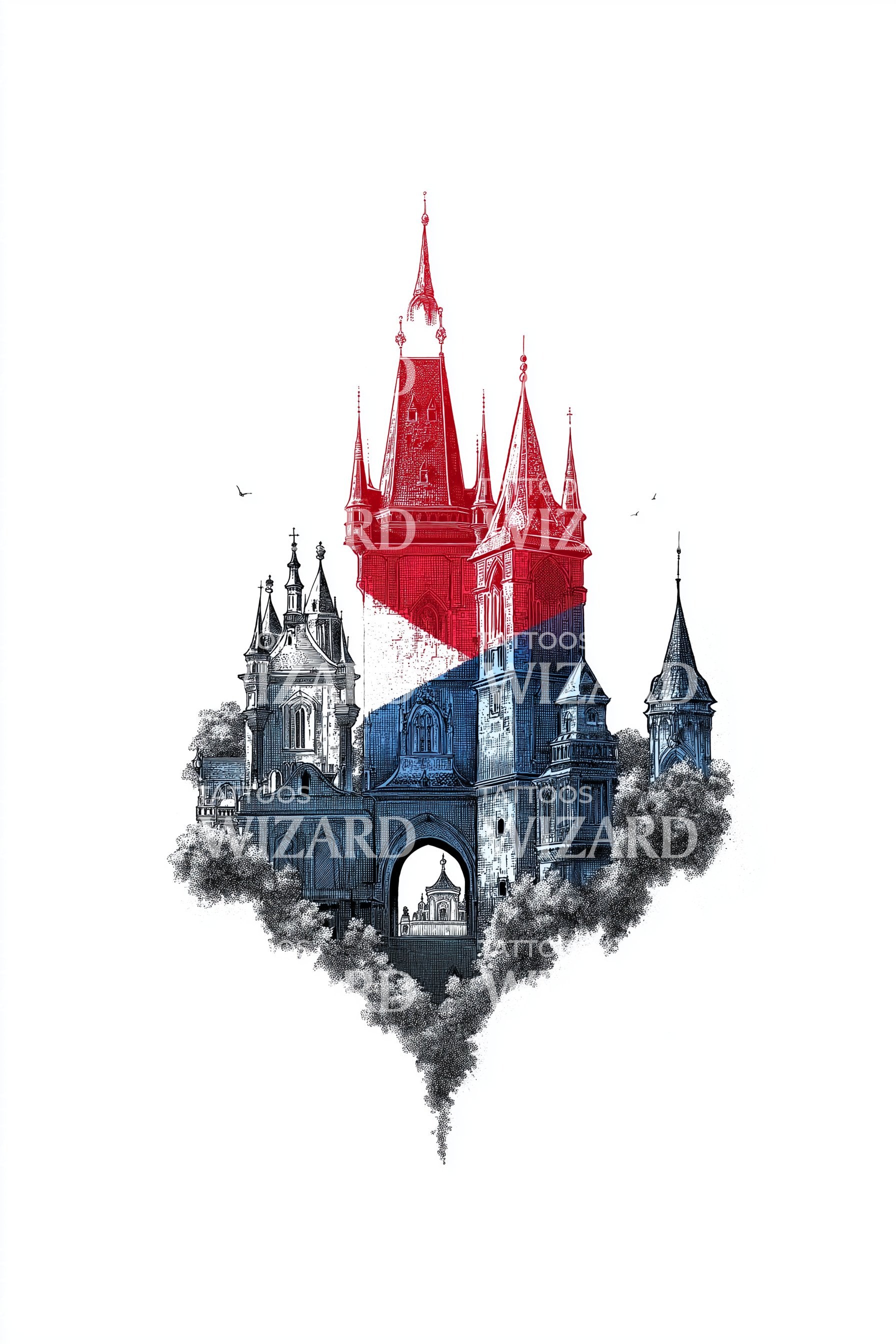 Experiencie a grandeza de Praga com este cativante desenho de tatuagem ilustrativa. A elegância arquitetónica gótica de um castelo checo é representada com uma intricada minúcia, enquanto as cores emblemáticas da bandeira acrescentam um toque patriótico. Para entusiastas de arquitetura e amantes de Praga, esta peça é ao mesmo tempo épica e pessoal.