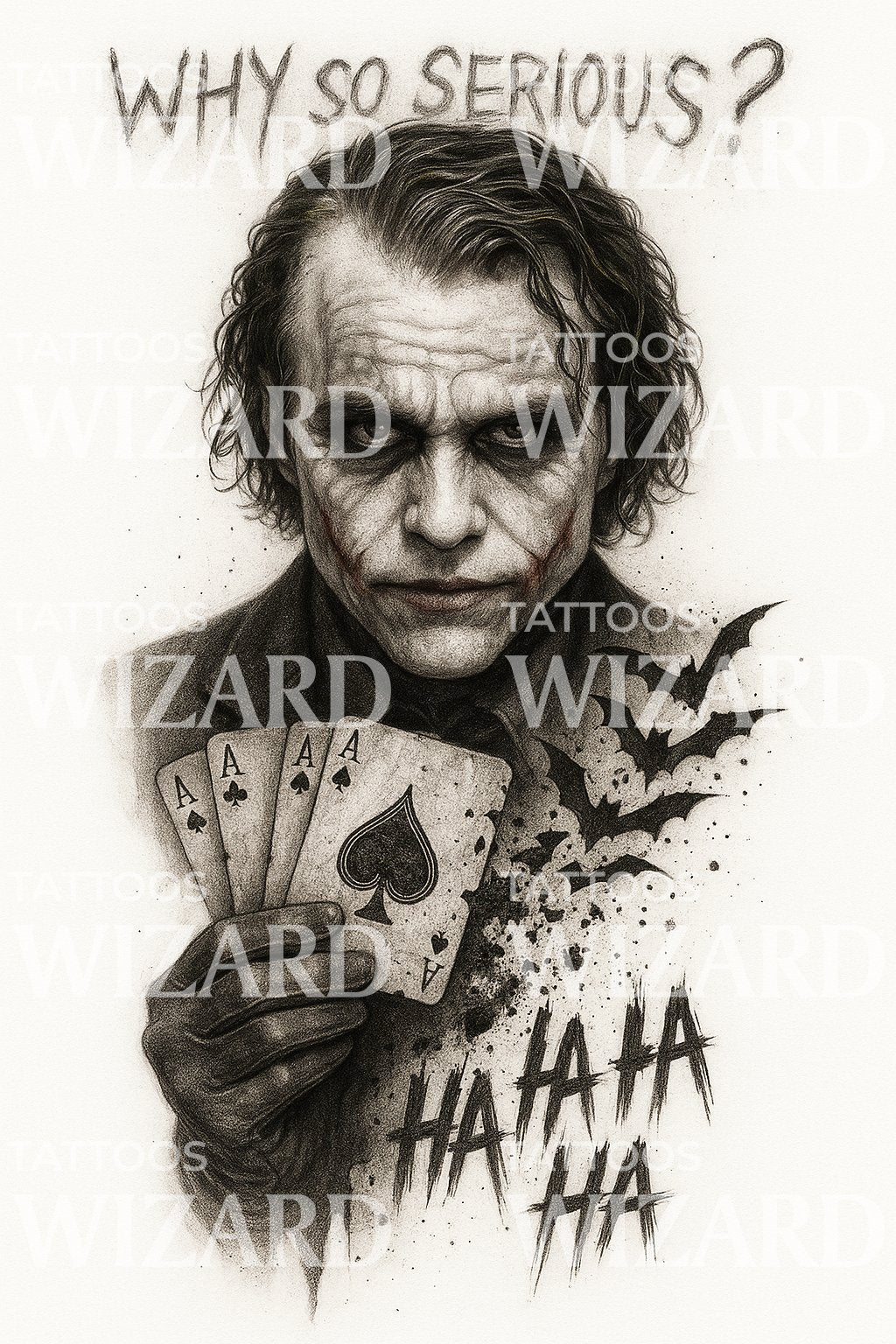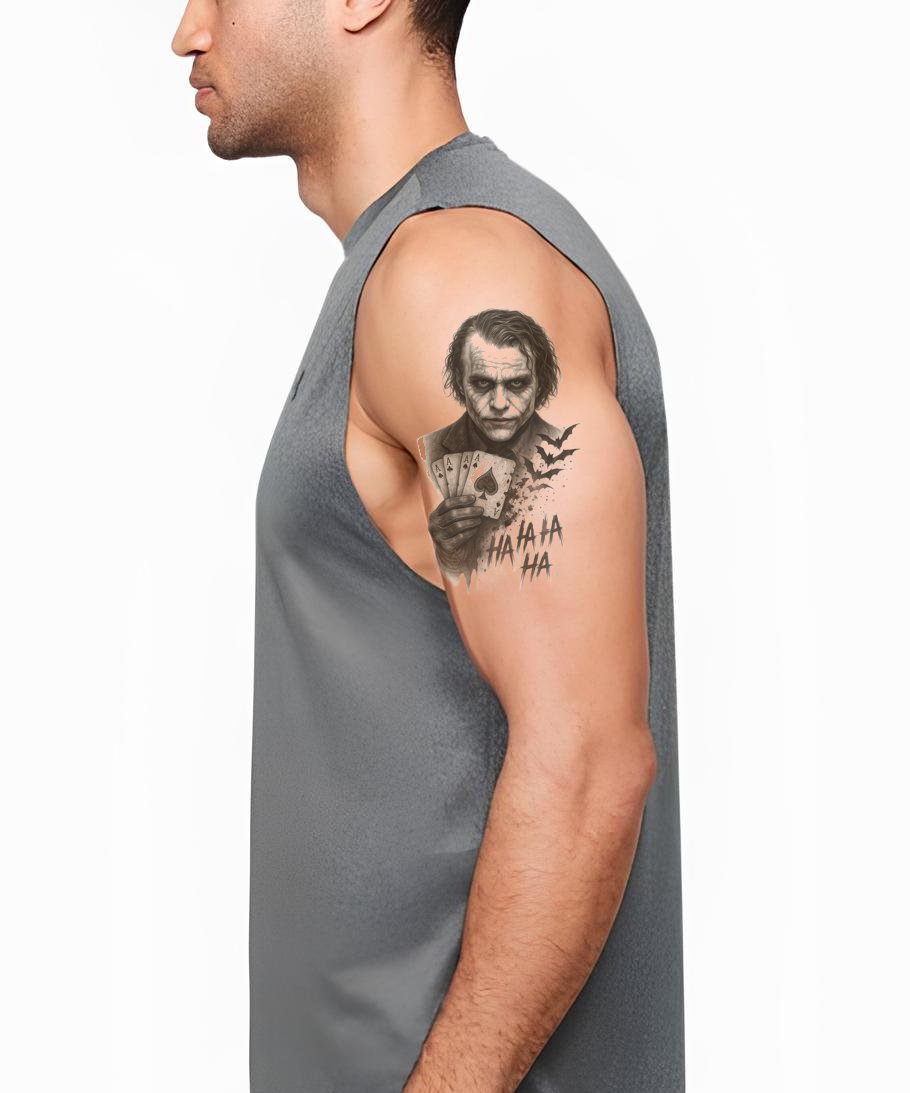 Mergulhe no mundo do caos e do riso com este design ilustrativo de tatuagem do Coringa. Apresentando uma combinação de preto e cinzento, acompanhada por cartas de banda desenhada encantadoras, o design incorpora o enigmático fascínio do Coringa. Ideal para amantes de arte única e tinta.