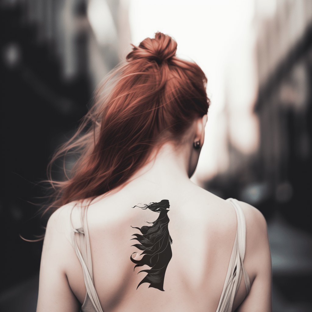 Ink-drawn silhouette in flowing cloak and wind-swept lines, a sketch of shadowed grace. The spirit walks through storm, symbolizing resilience, transition, quiet power, and steadfast calm. Wearing it feels like carrying weather in your ribs. Best along forearm, calf, spine, or ribs, where vertical currents amplify movement.