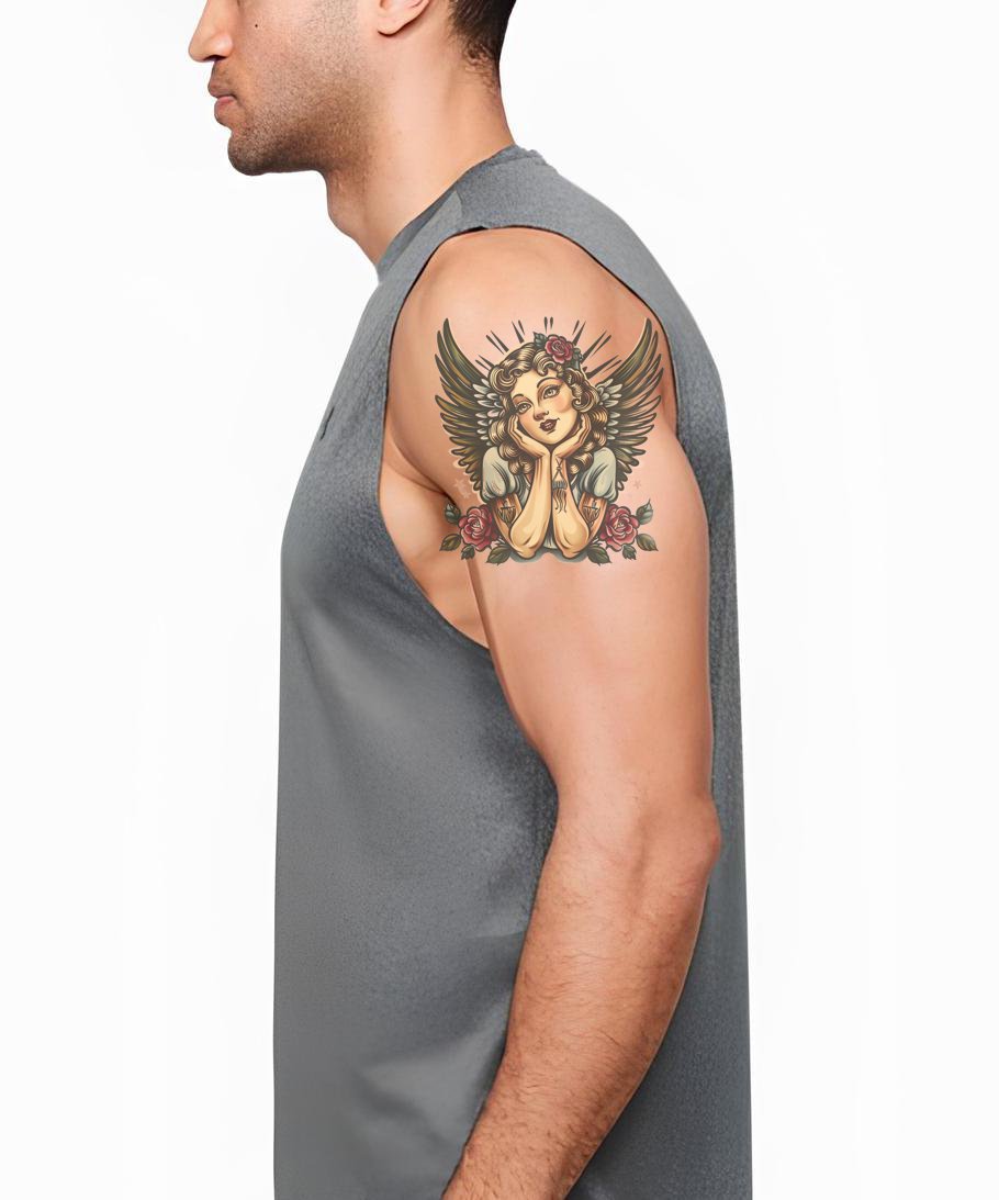 Eleve o seu estilo de tatuagem com este cativante desenho de tatuagem de Anjo Mulher Oldschool. Com asas delicadamente gravadas que personificam a feminilidade e um encanto oldschool intrigante, certamente vai atrair todos os olhares. É a combinação perfeita entre o doce e o intenso, simbolizando o poder feroz feminino.