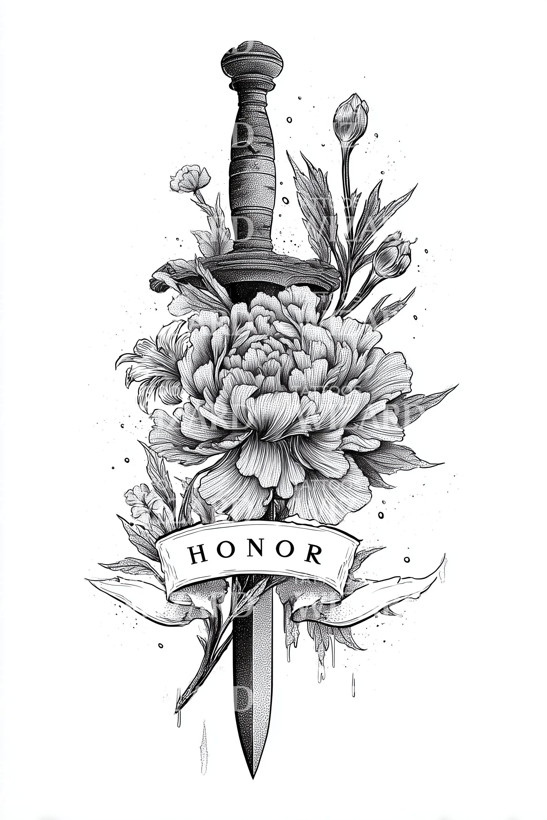 Apresentando um design ilustrativo clássico, esta tatuagem une perfeitamente a força audaz de uma adaga com a beleza delicada de um bouquet. Ecoando temas de honra e determinação inabalável, oferece uma elegante amalgamação de imagens tradicionais envoltas numa deslumbrante estética floral.