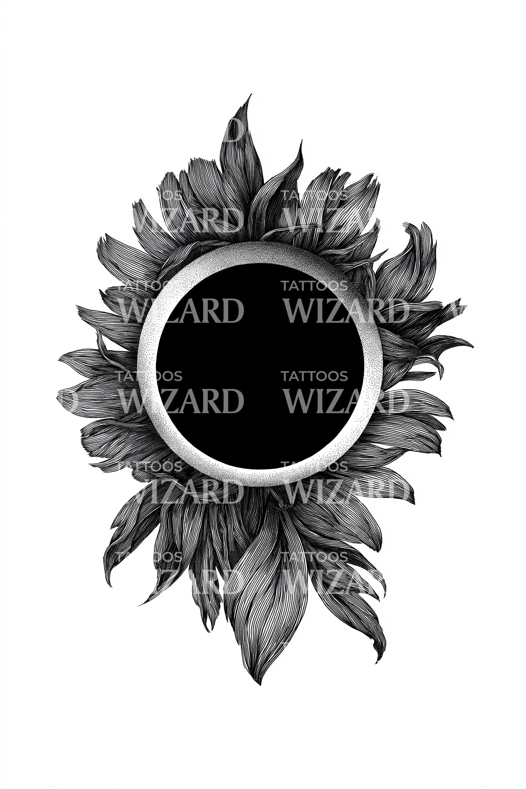 Experimente a hipnotizante interação entre luz e escuridão com este impressionante desenho de tatuagem blackwork. Apresentando um girassol contra o pano de fundo de um eclipse solar, esta peça incorpora luminosamente o profundo contraste entre a flor radiante e o vazio de um apagão cósmico.