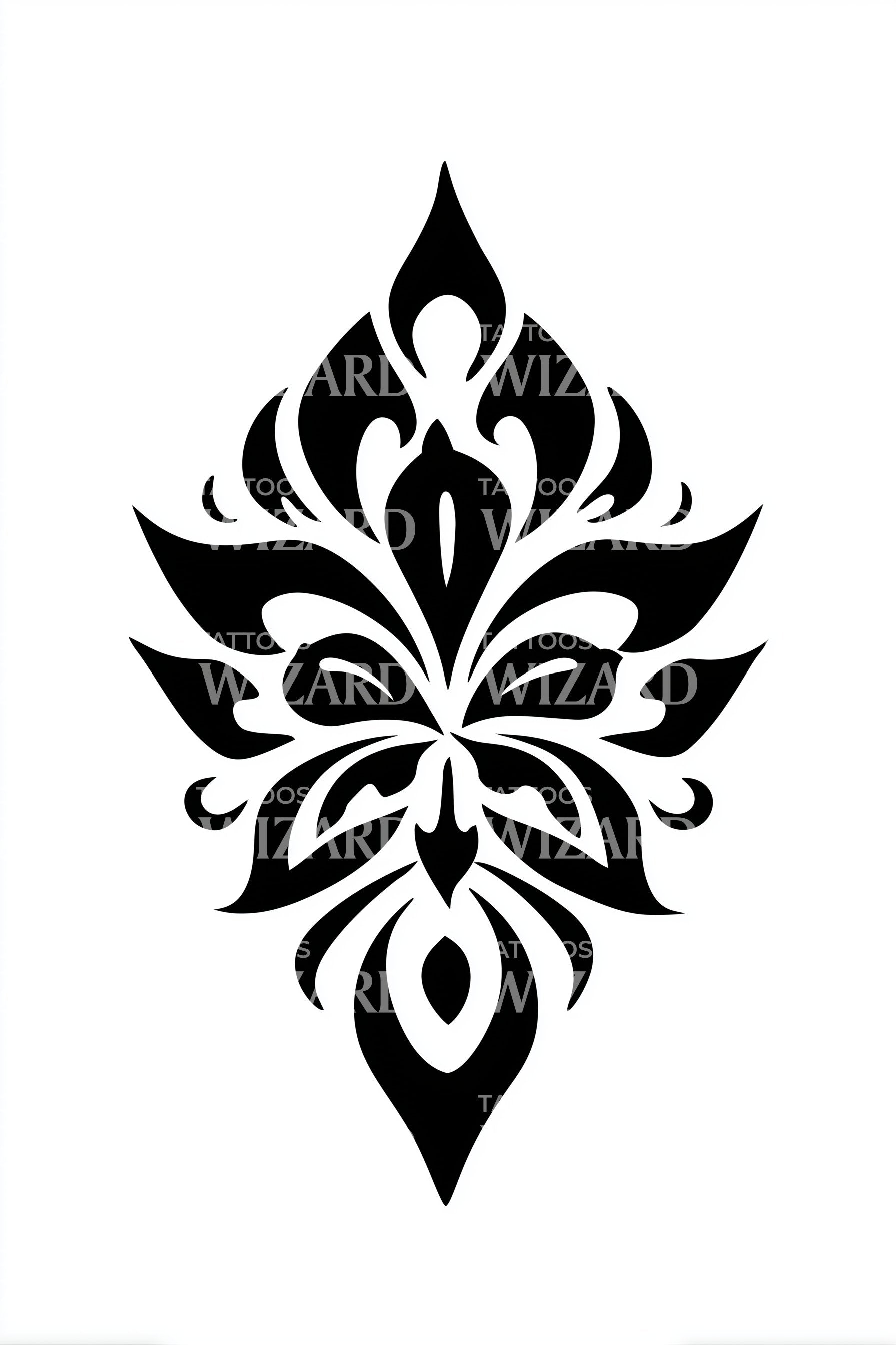 Abraça um símbolo eterno de beleza com este desenho de tatuagem ornamental. Apresentando um padrão damasco blackwork simétrico, cria uma combinação perfeita de elementos clássicos e florais. Esta obra-prima estética adicionará um toque elegante e intemporal à tua coleção de arte corporal.