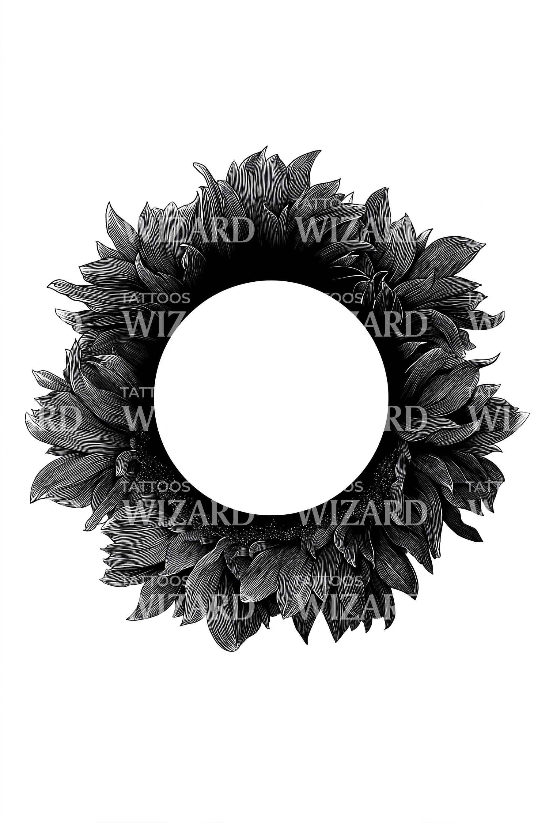 Mergulhe na profundidade deste design de tatuagem blackwork escura. Elementos artísticos de halo e anel fundem-se para significar uma conexão divina, envoltos numa flor negra em plena floração. O detalhe intricado do design realça a beleza do contraste, tornando-o uma escolha ideal para quem ousa ser distinto.