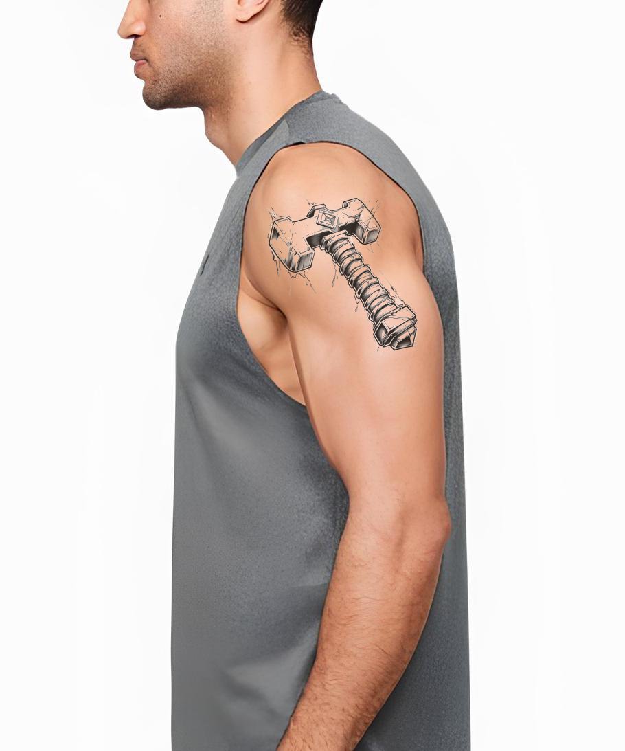 Abraça o teu lado Viking com o nosso design de tatuagem inspirado em Thor. Impecavelmente detalhado a preto e cinzento, esta peça poderosa apresenta um martelo de Thor magistralmente elaborado, simbolizando força e proteção. Uma expressão audaz da mitologia nórdica, perfeita para os destemidos e ousados.